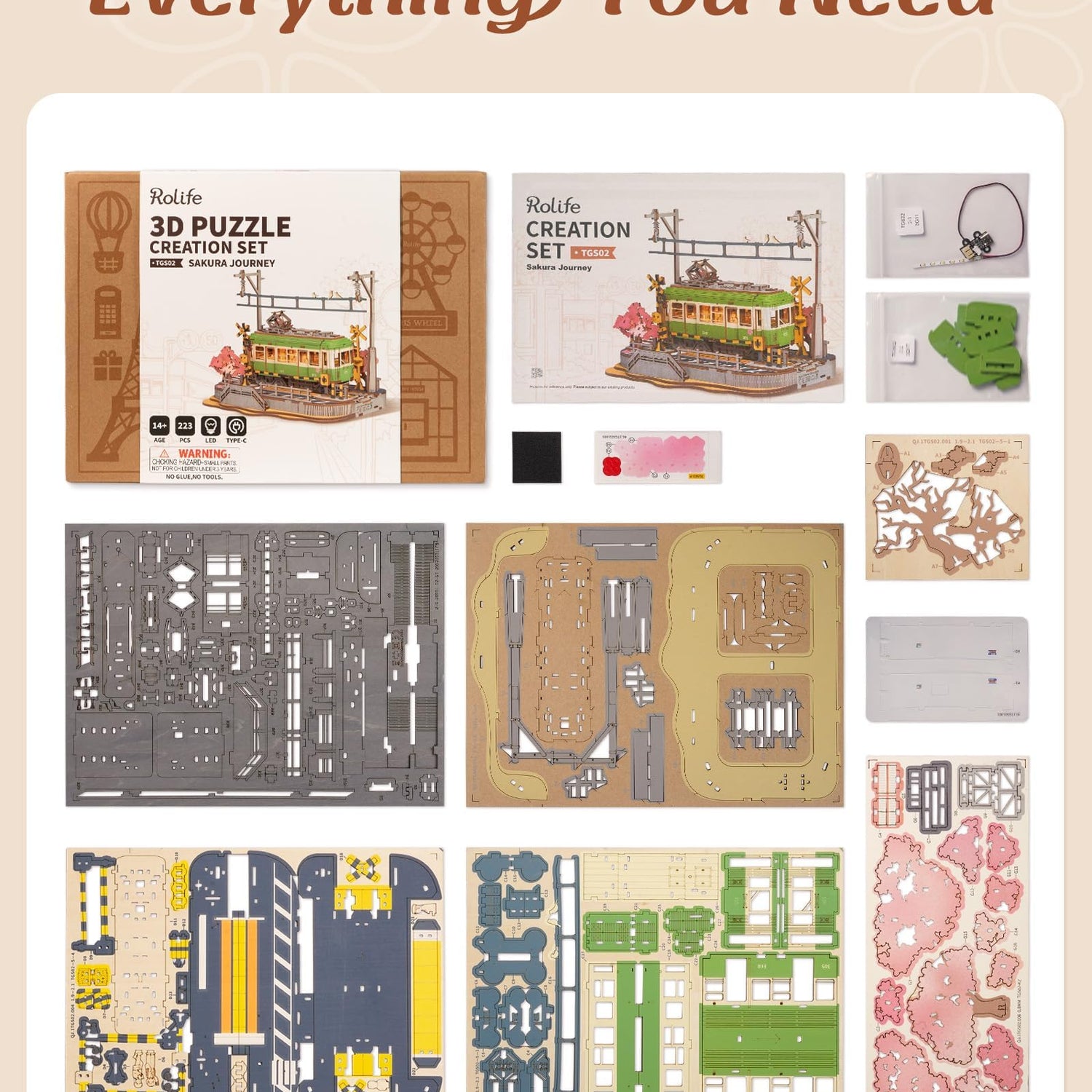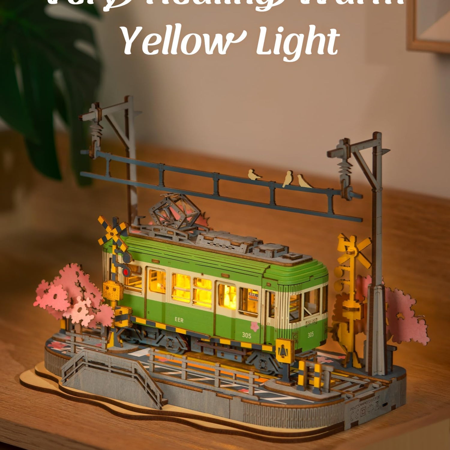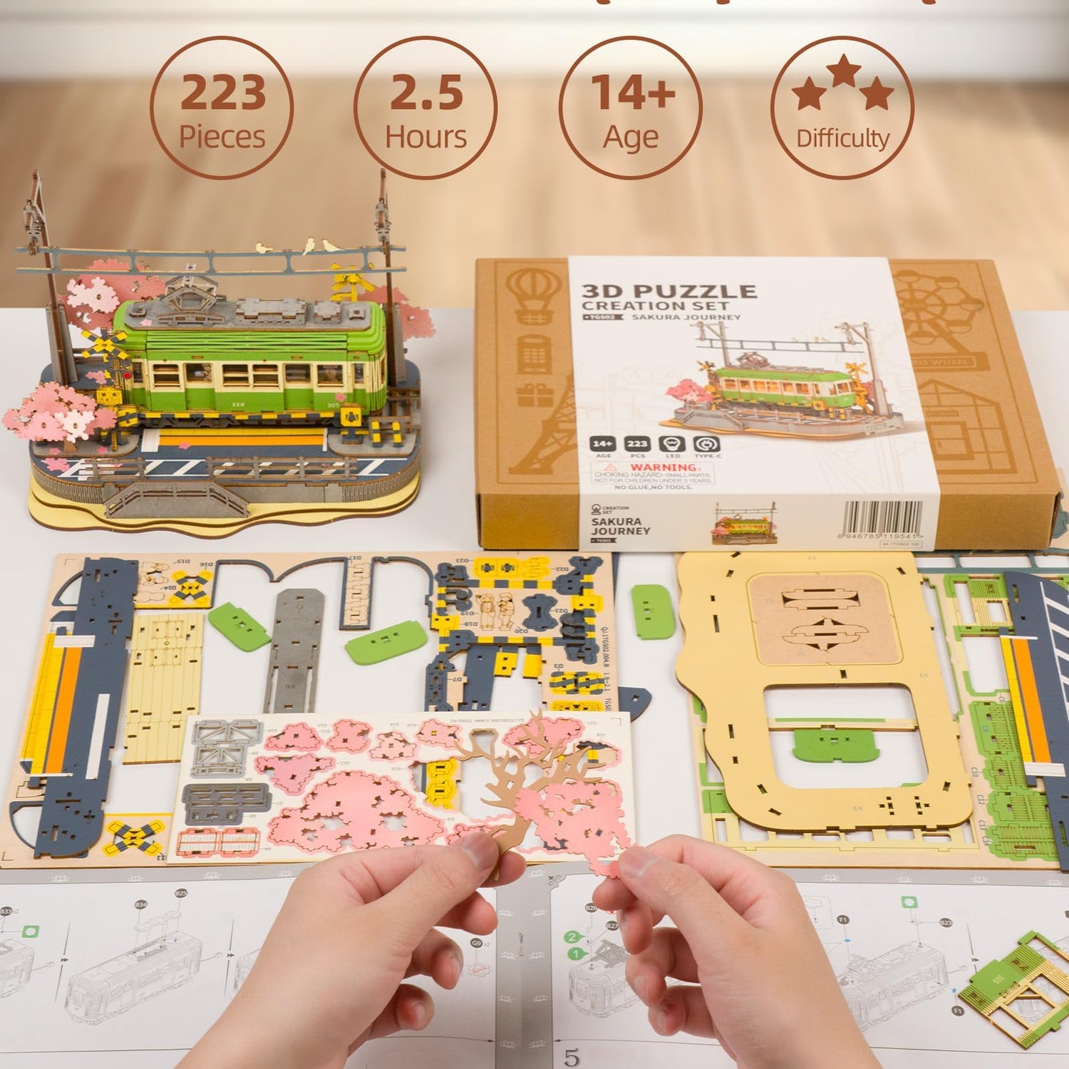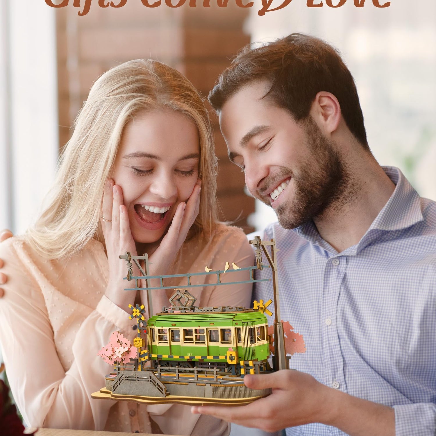 Rolife 3D Wooden Puzzle for Adults, Sakura Journey Tram DIY Model Building Kits with LED Lights, Creative Kids Craft Hobby Gift and Brain Teaser Home Decor Assembly Toy