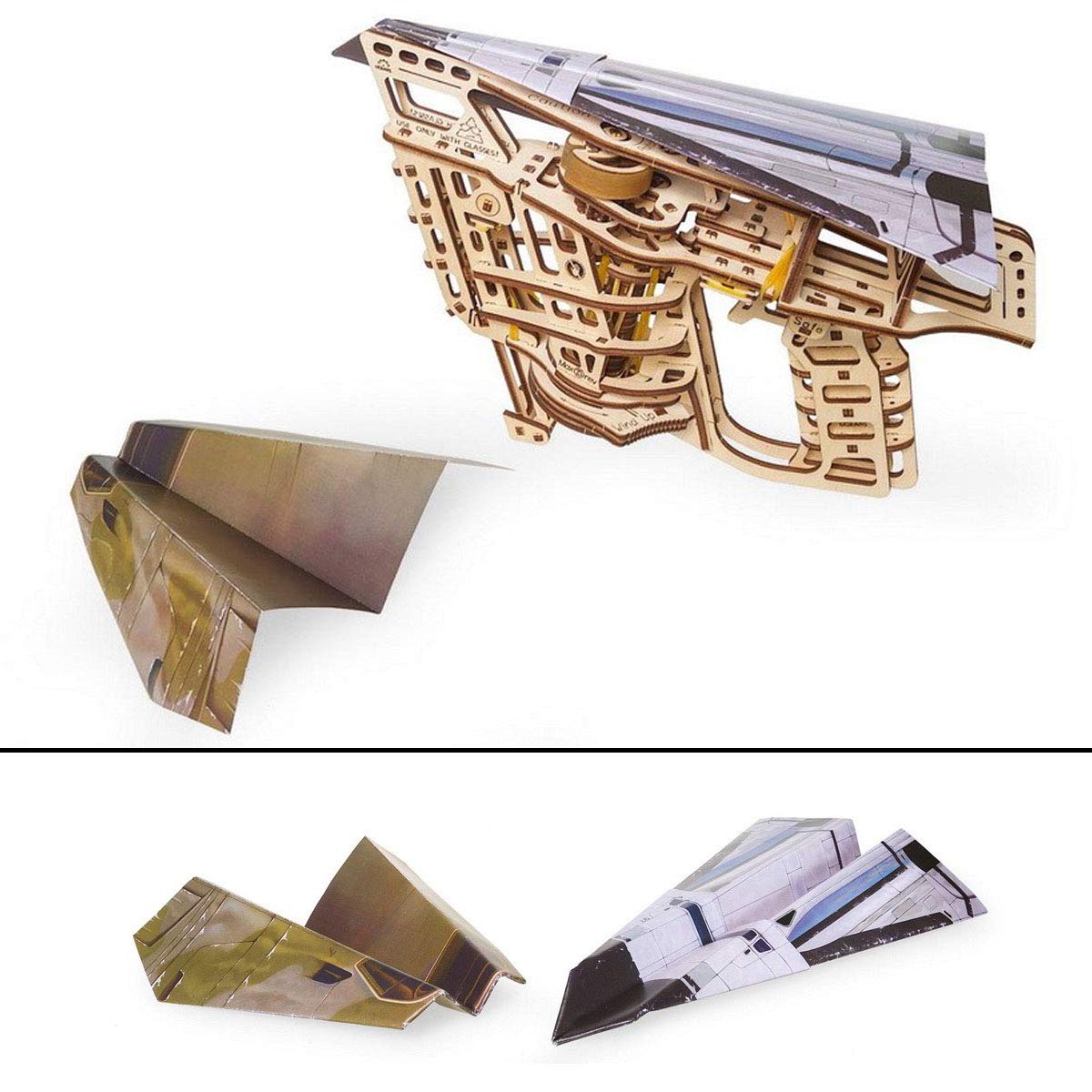 Details: With the UGears Flight Starter you can build something amazing without any tools. Flight Starter is a mechanical launcher for light flying airplane models – three are included in this UGears kit. The model’s one-of-a-kind design is a pure work of imagination that produced a look resembling something from outer space – a star ship, a shuttle or a blaster gun from a science fiction adventure film. Includes step-by-step instructions with color pictures. 198 pieces, assembly time approximately 3 hours. Perfect STEM activity. No glue or special tools are required to assemble this UGears mechanical launcher. Kit includes high-quality sustainable wood parts that fit together like a puzzle. Kit also includes a plywood glider and two paper airplanes you can use with your Flight Starter, along with any planes you design. The all sci-fi design is implemented in the UGears skeleton steampunk style that allows you to look inside the working mechanism that you will assemble with your own hands. The launcher is equipped with a rubber band motor that provides tension that powers a plane’s release. The trigger that sets off the mechanism has a safety lock. Tension and therefore the distance your aircraft is going to cover are controlled by a winding crank. The range of your new cool ballistic model can exceed 30 meters – depending on the “bolts” used and how tight the crank is wound. A special support makes the crank a part of the platform for the aircraft you will launch. Depending on how you adjust the angles of the wings and other elements of a plane before launching it into the sky, you can make it go into a loop, barrel-roll, nose-up and other fun maneuvers.