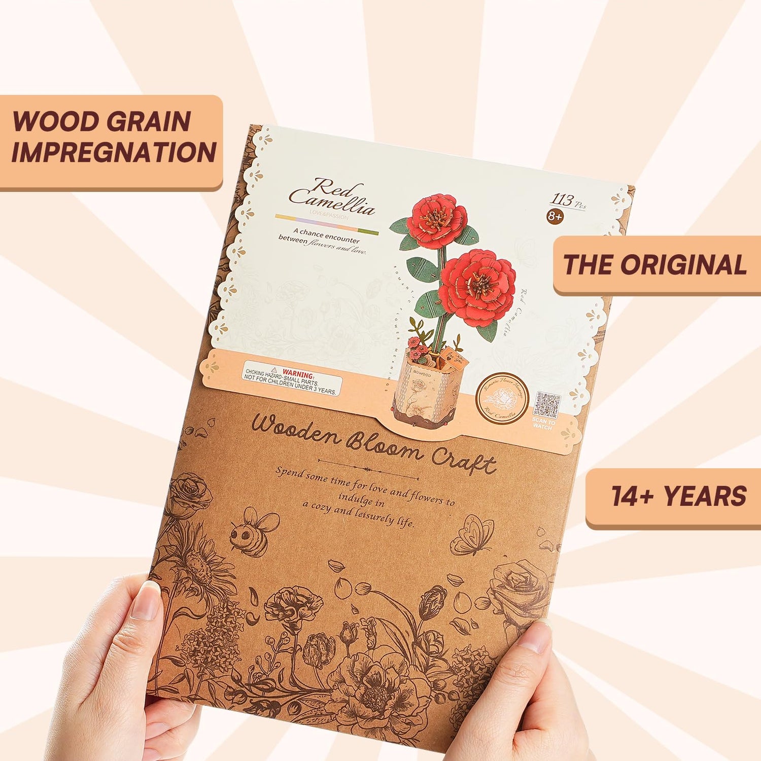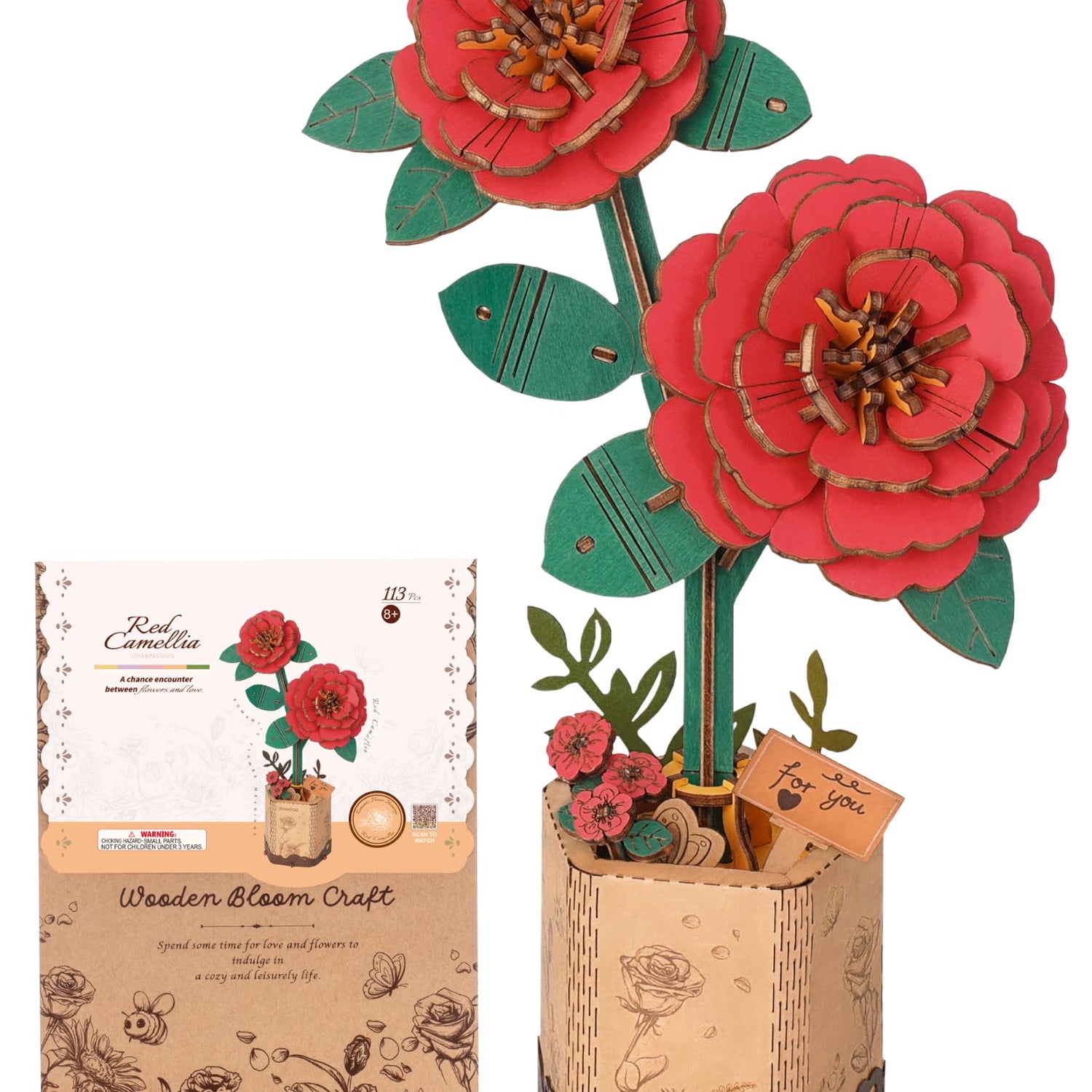 Wowood 3D Flower Wooden Puzzles for Adults-Red Camellia, DIY Wooden Flowers Model Kit Building Set Crafts for Adults to Build, Botanical Collection/Ideal Creative Gift Ideas/Housewarming (113PCS)