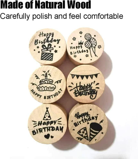 6 Pcs Wooden Stamps Set round Rubber Stamps for Card Making Happy Birthday Pattern