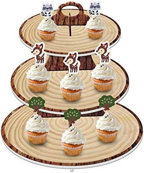 Wood-Grain 3-Tier Cardboard Cupcake Stand/Tower | Wild One, Woodland Animal Baby Shower