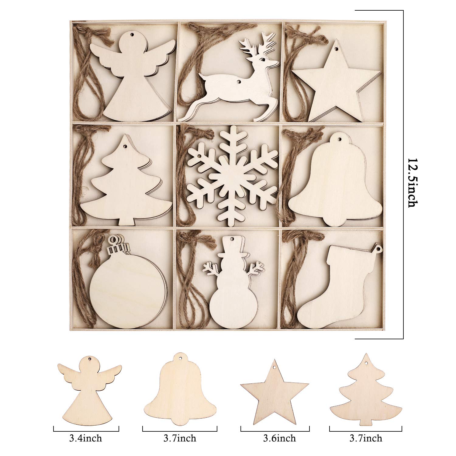 - Wooden Ornaments for Christmas Tree: This value set includes 27 unfinished wooden Christmas ornaments in 9 festive styles (Angel, reindeer, star, tree, snowflake, bell, light bulb, snowman, stocking). Each shape contains 3PCS,comes with a pre-drilled hole for easy hanging. The kit also includes burlap rope—all packed in a wooden storage box