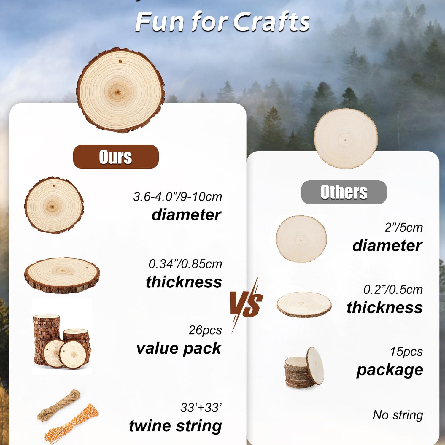 - Great start to a fun craft. Each of round wood circles with tree bark is unique. No duplicate, no identical. Material: douglas fir. Diameter range of the wood slice ornaments 3.6-4 inch. Thickness: 0.34in(0.85cm). There is strict wood checking and moisture ratio control on every single wood slice for crafting.