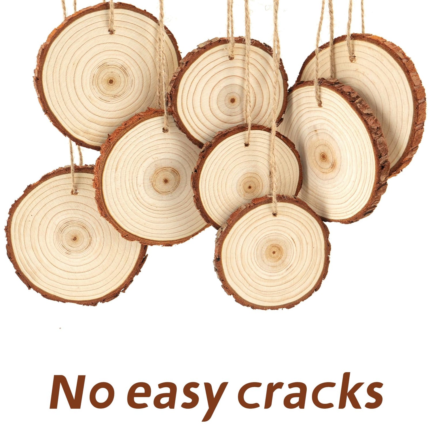- No Easy Cracks - Quality unfinished natural wood slices circles with bark. Well made, sturdy, and has a nice texture. Perfect for Christmas wooden crafts decorations, wooden wedding decorations, wooden coasters, bottle & candle base, photo props, name tags, gift tags, gifts for children, gift labels, home decorations, etc.