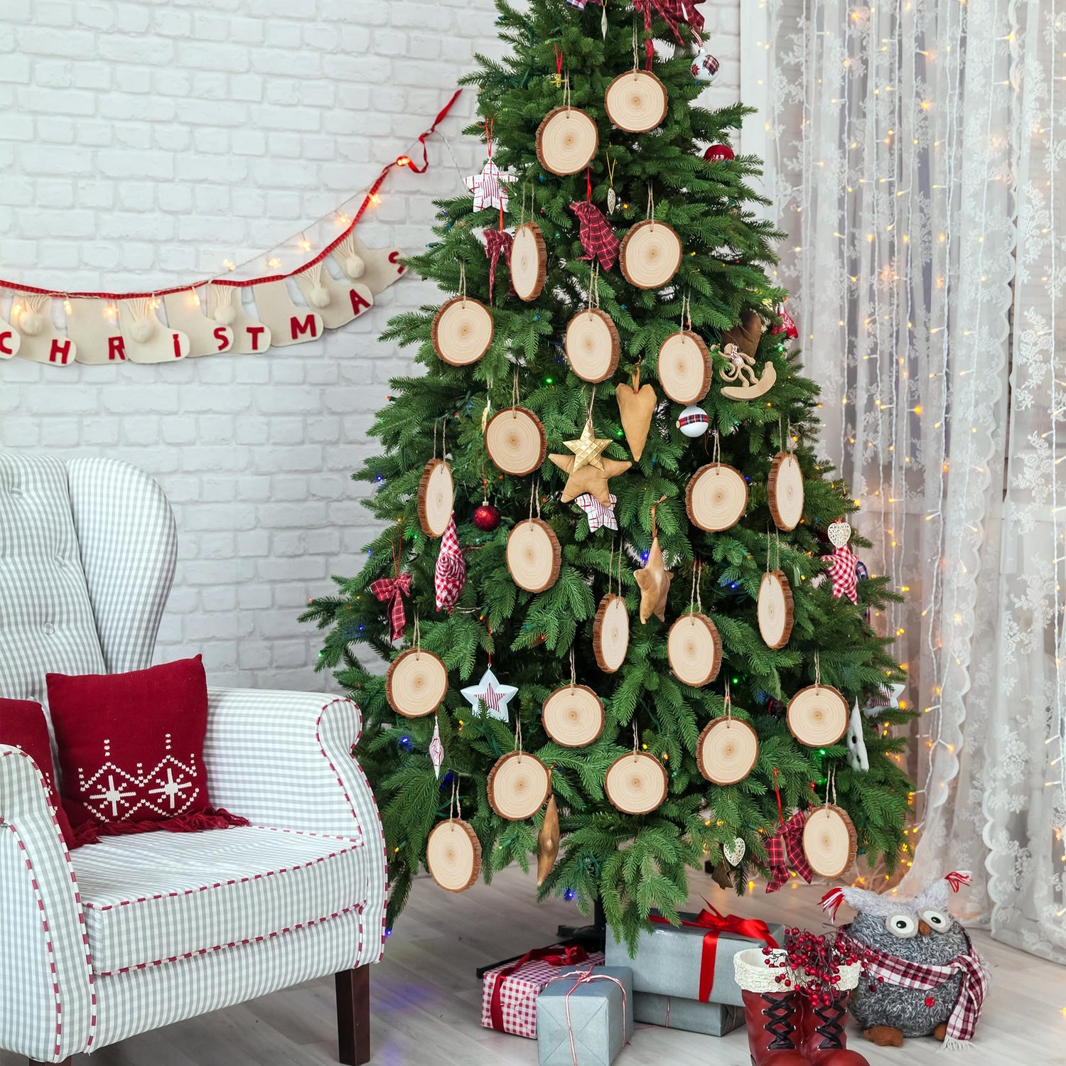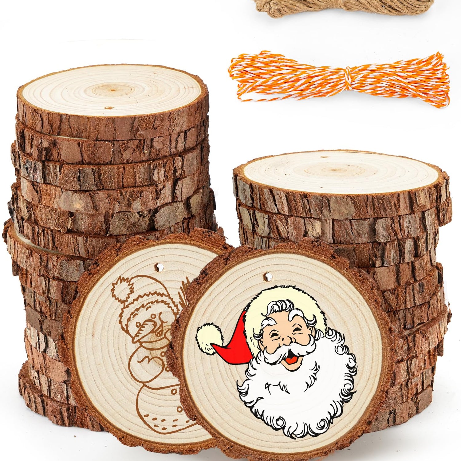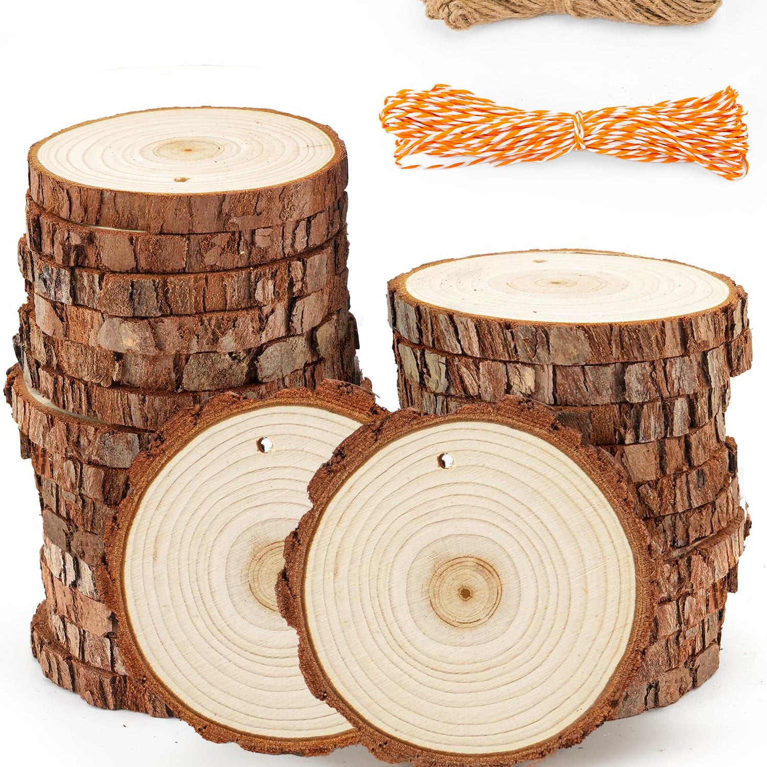 - Great Value Pack natural wood slices: 26 PCs x tree cookies bulk craft (dia: 3.6-4". thick: 0.34"), 1 x 33ft jute rope, 1 x 33ft orange-and-white intersecting rope. Shrink wrap packaging avoids tree barks coming off en route.