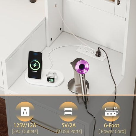 • HENBC Vanity with Mirror and LED Lights, Glass Top Vanity Desk with Charging Station(Wireless+USB+Type-C), RGB Makeup Table Set with Stool/Makeup Organizer/6 Drawers (White) HNEBC