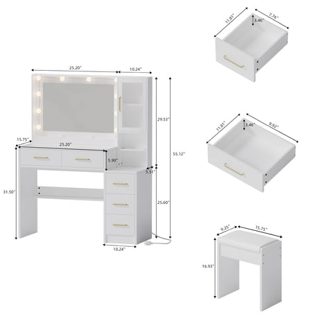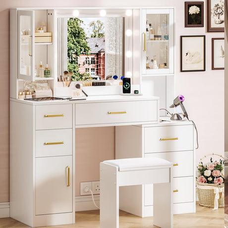 • Vanity Desk with Mirror and LED Lights, 43'' W Makeup Vanity Desk with Power Outlet, 3 Color Modes, 7 Drawers Vanity Table with Chair, Dressing Table for Bedroom, Dressing Room Homesflex