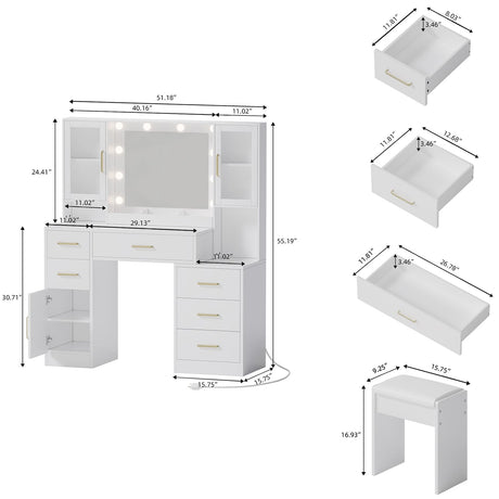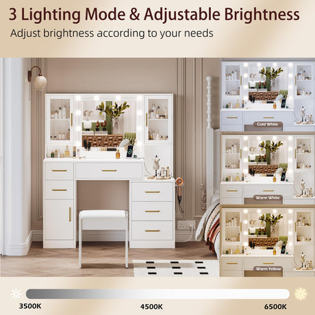 • VOWNER Vanity with Lighted Mirror - 47" Makeup Vanity Desk with 7 Drawers, 3 Storage Shelves and Outlet, 3 Color Lighting Modes with Adjustable Brightness, Makeup Desk with Stool for Bedroom, White VOWNER
