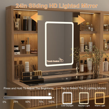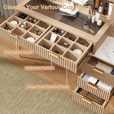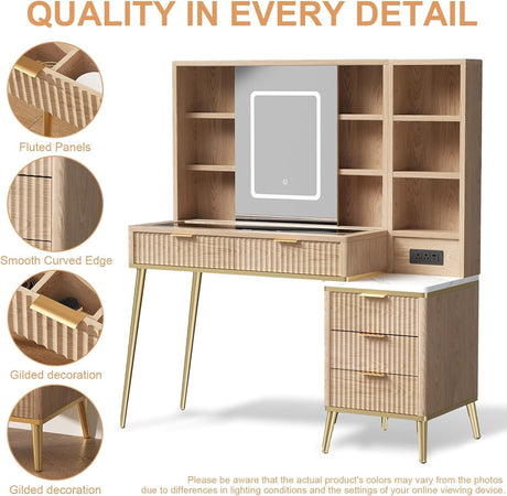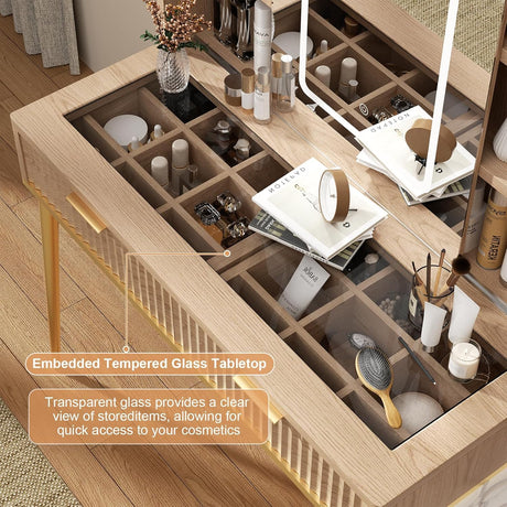 • AMERLIFE 47.2" Fluted Vanity Desk with Mirror and Adjustable LED Lights, Large 7 Drawers Makeup Table with Glass Top and Charging Station for Women and Girls, Bedroom or Dorm, Natural Oak AMERLIFE