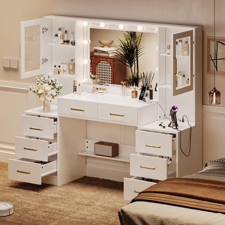 • Vanity Desk with Mirror and 11 LED Lights, 43'' Makeup Vanity Table with Power Outlet & Chair, Dressing Table with 3 Drawers, 2 Cabinets and 6 Open Shelfs for Bedroom, White Decofy