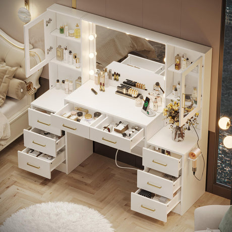 • Vanity Desk with Mirror and Lights, Diamond Edition Vanity Desk with 9 Drawers and 6 Storage Shelves Dressing Table, Vanity Desks with Power Outlet and 3 Color Modes 10 LED Bulb for Girls Bedroom Dowinx