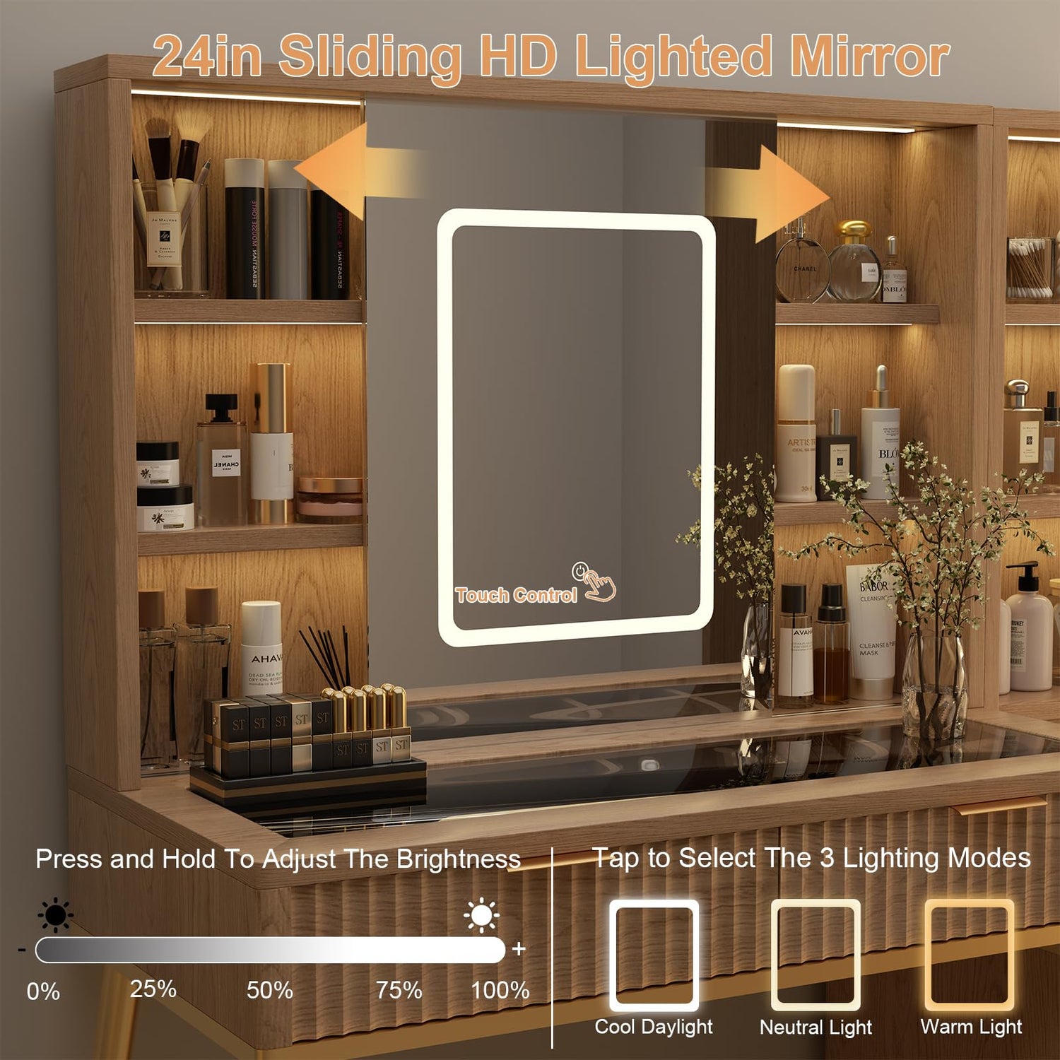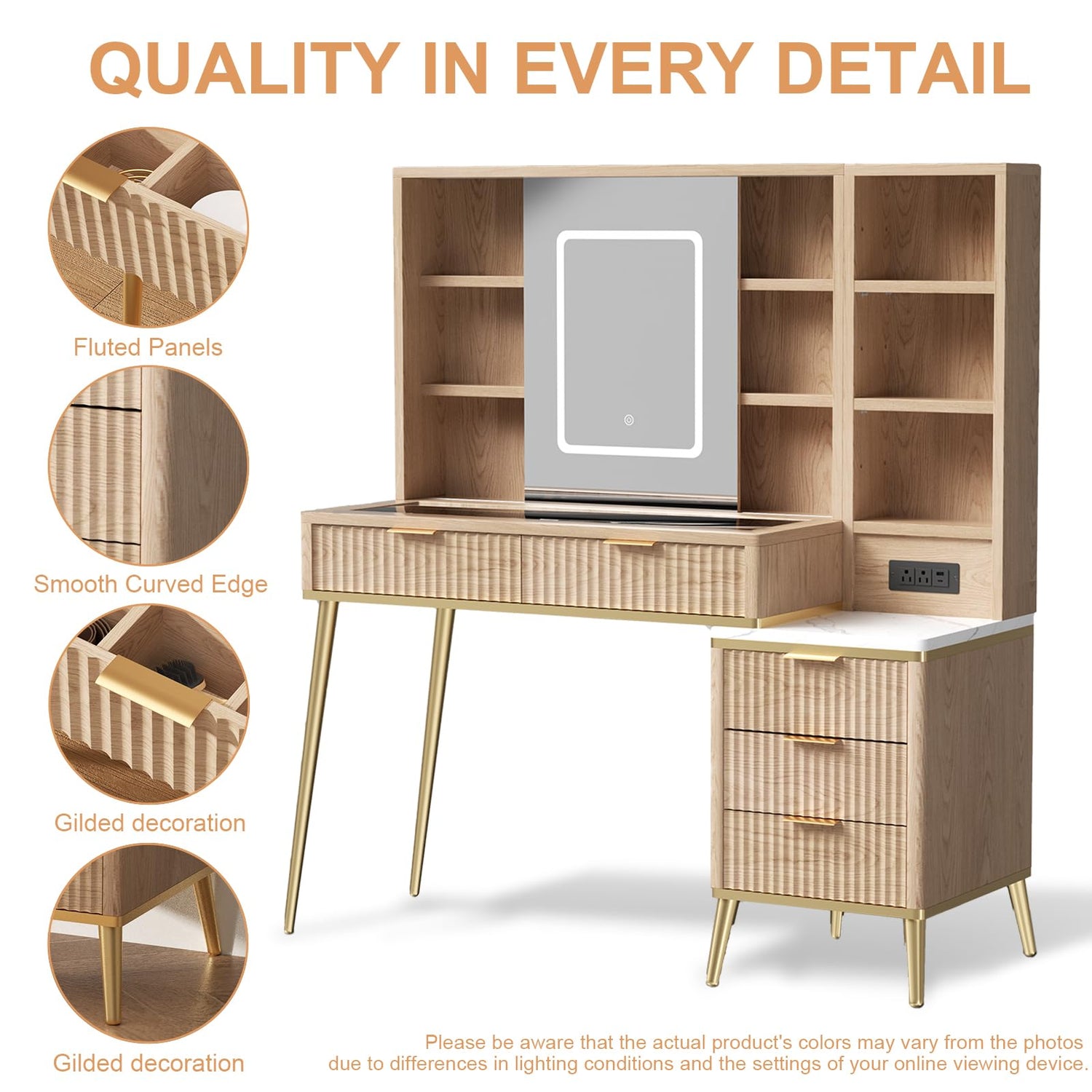 - 【Sliding HD Lighted Mirror & Adjustable light】 Our 48" fluted vanity desk with mirror and lights offers a HD lighted sliding mirror, which can ensure optimal lighting for flawless makeup application compared with others' fixed mirrors. High-quality LEDs around the mirror can be switched to warm yellow, warm white, cool white, just tap to select the lighting modes you like. Long-pressing the button allows you to adjust the brightness of the lights. 【Equipped with charging Station for easy access to your small appliance.】