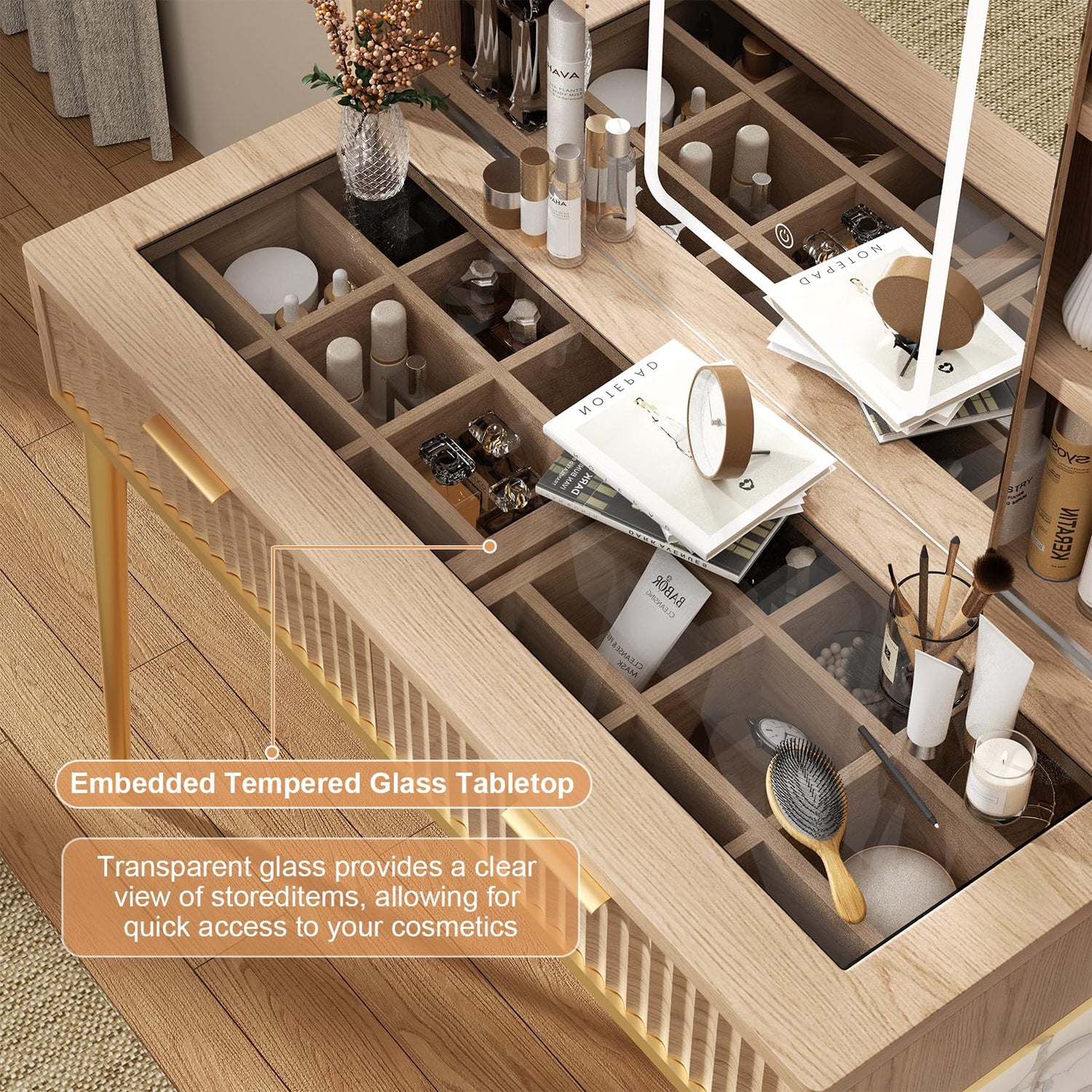- 【Luxury Glass Tabletop】 The glass top adds a touch of luxury while also being easy to clean and maintain. Transparent glass provides a clear view of stored items, allowing for quick access to your cosmetics. The spacious surface provides ample space for your cosmetics, brushes, and other beauty essentials. Detachable partition let you to classify your various cosmetics easily.