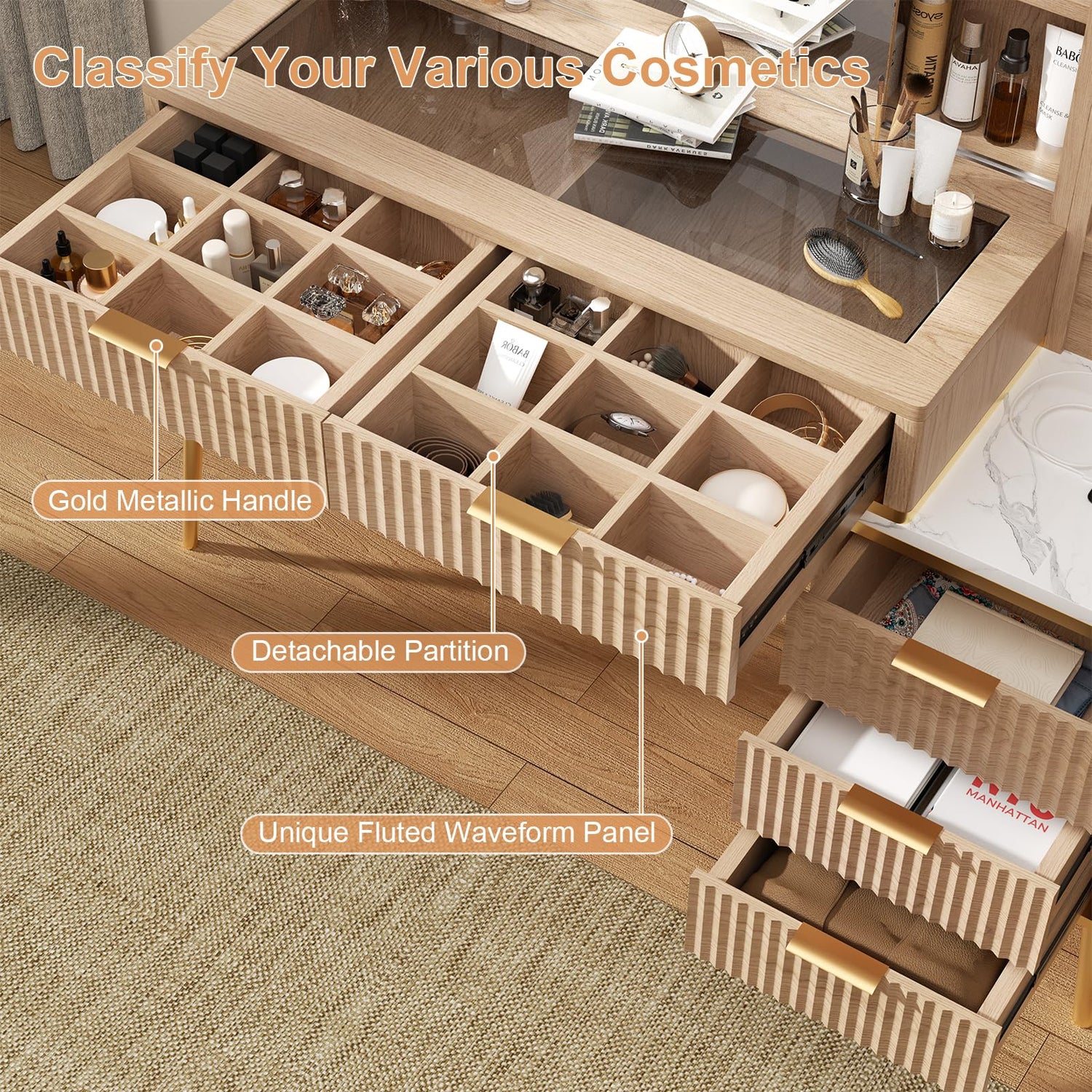 - 【Artistic and Unique Design】Distinct fluted panel design enhances the dressing table with a sense of elegance and uniqueness. The gold metal handle and cylindrical legs add a luxurious and refined touch to the overall look of the desk. All these meticulous detail adds an extra layer of aesthetic charm, elevating the overall look of the makeup vanity to be more exquisite and unique.