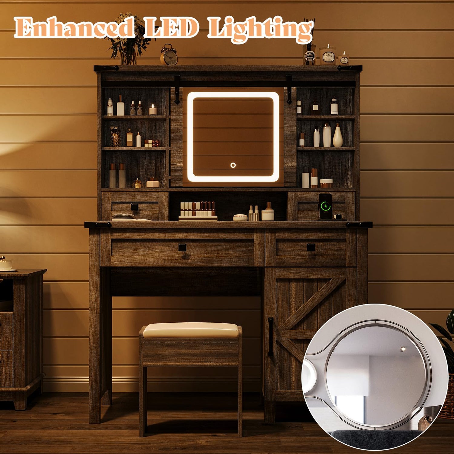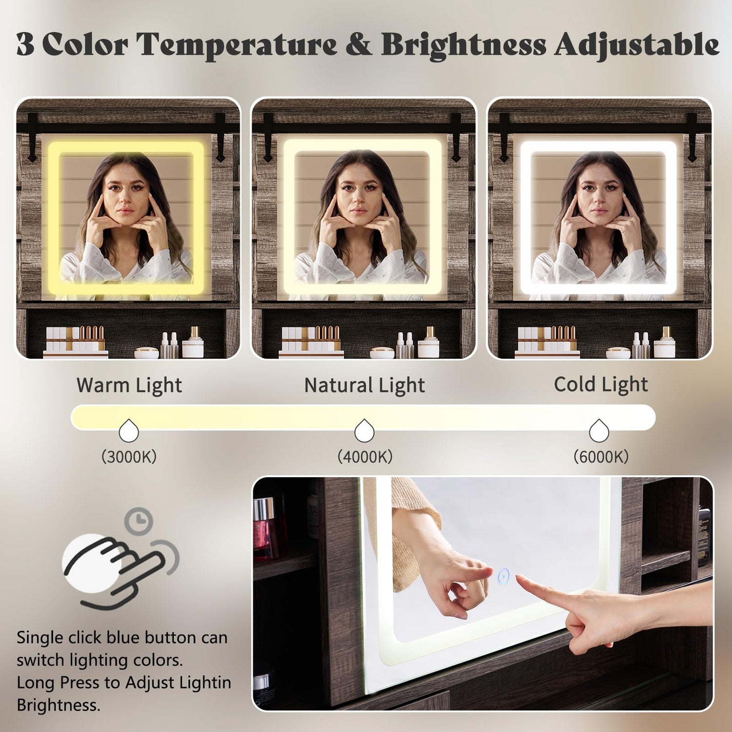 • Chic Farmhouse Vanity Desk: Glam glass top, distressed wood finish, and barn door details add rustic charm, while the sliding lighted mirror enhances elegance in your bedroom.