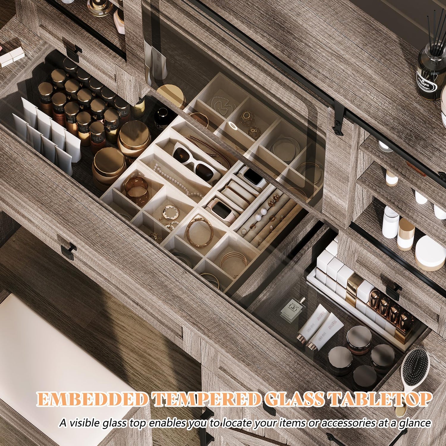 AMERLIFE 42'' Farmhouse Makeup Vanity Desk with Sliding Mirror and Lights, Glass Tabletop Vanity Table with 2 Drawers & Shelves for Bedroom, Light Rustic Oak