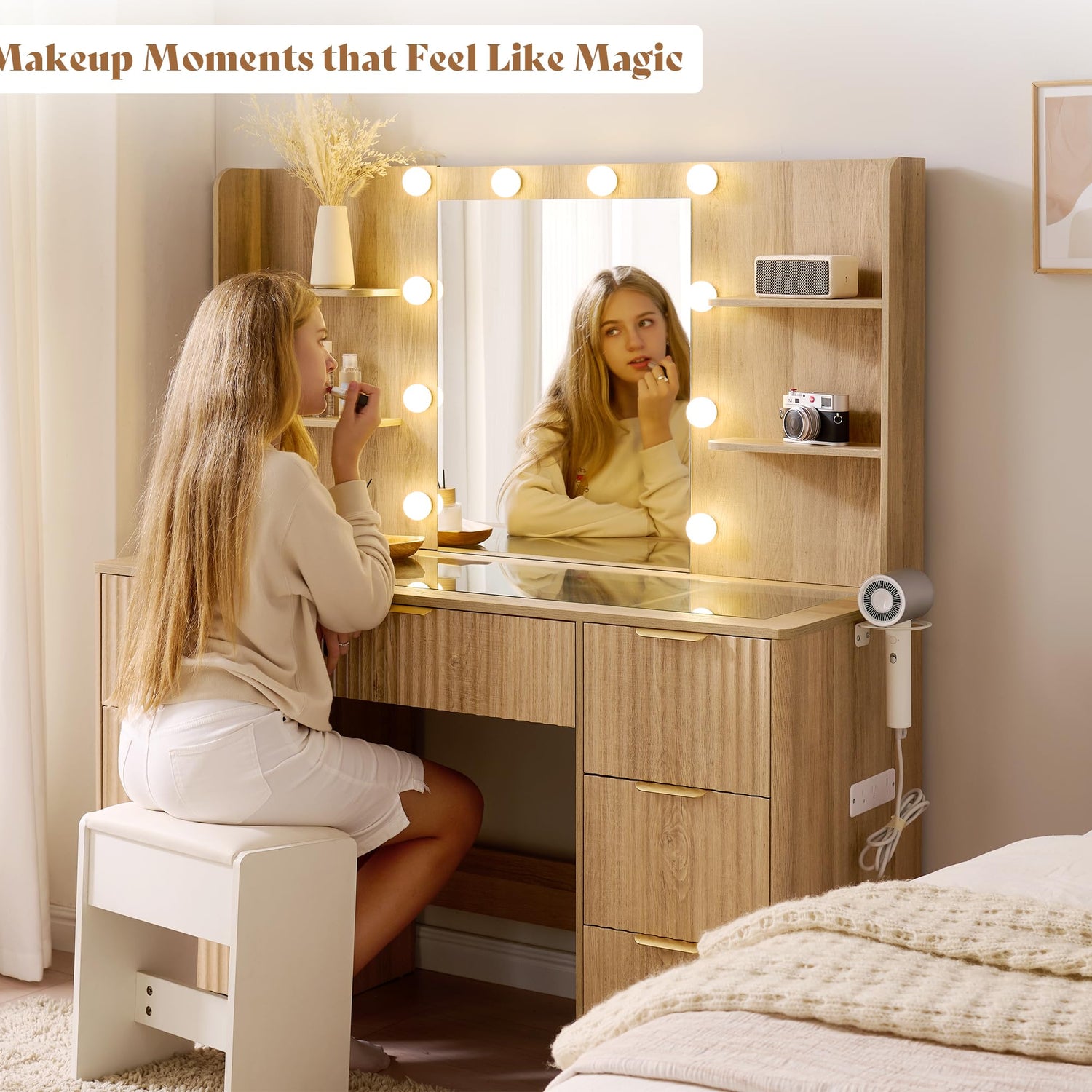 - 【All-in-One Makeup Vanity Desk】 This multifunctional vanity table integrates a tri-tone lighted mirror with stepless dimming, 7 spacious drawers, built-in charging ports, and a hair dryer holder for a seamless beauty experience.