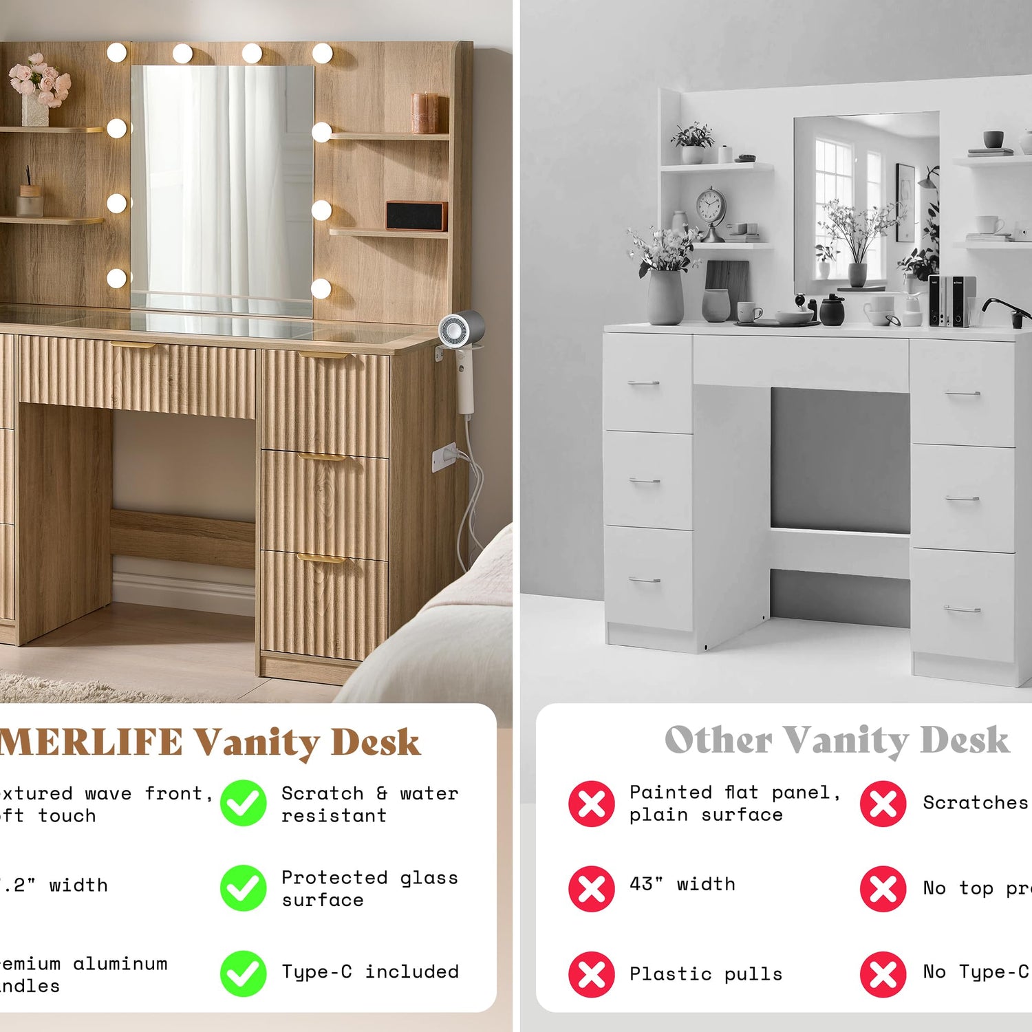 - 【Built-In Charging Hub & Blow Dryer Holder】 This wooden vanity desk includes 2 AC outlets, 1 USB, and 1 Type-C port to charge your phone, tablet, or hair tools. The built-in blow dryer holder keeps everything handy while you get ready.