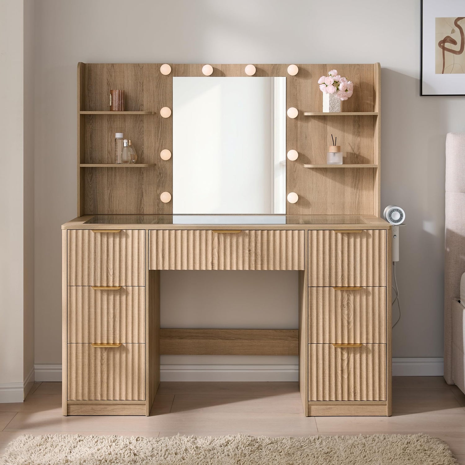AMERLIFE 47.2" Fluted Vanity Desk with Mirror and Adjustable LED Lights, Large 7 Drawers Makeup Table with Glass Top and Charging Station for Women and Girls, Bedroom or Dorm, Natural Oak