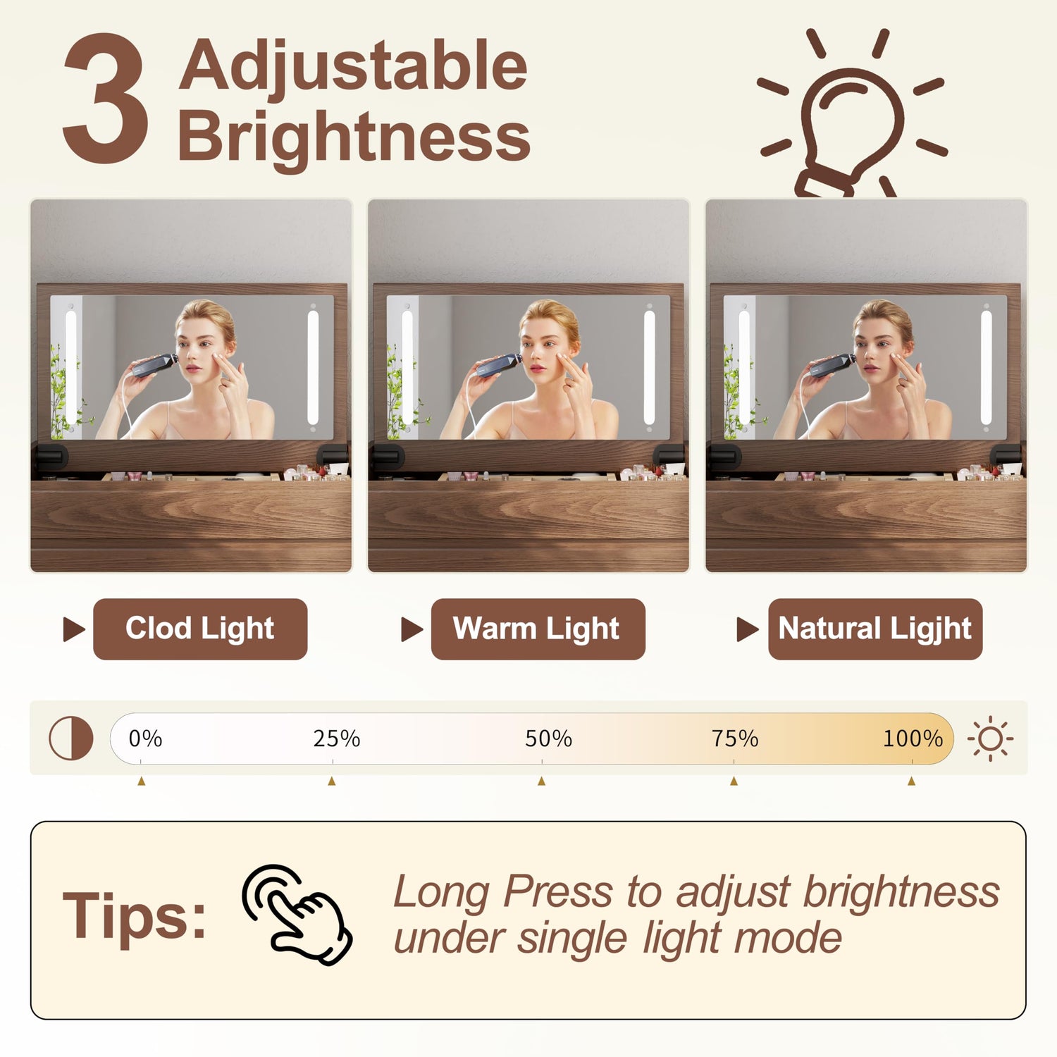 AQIMUELE Wood Vanity Desk with Mirror and Lights, Dressing Vanity Table Vanity Set 4 Drawers, 40 Inch Large Make Up Vanity Table Wooden with 3 Lighting Modes for Bedroom Walnut(with Adapter)