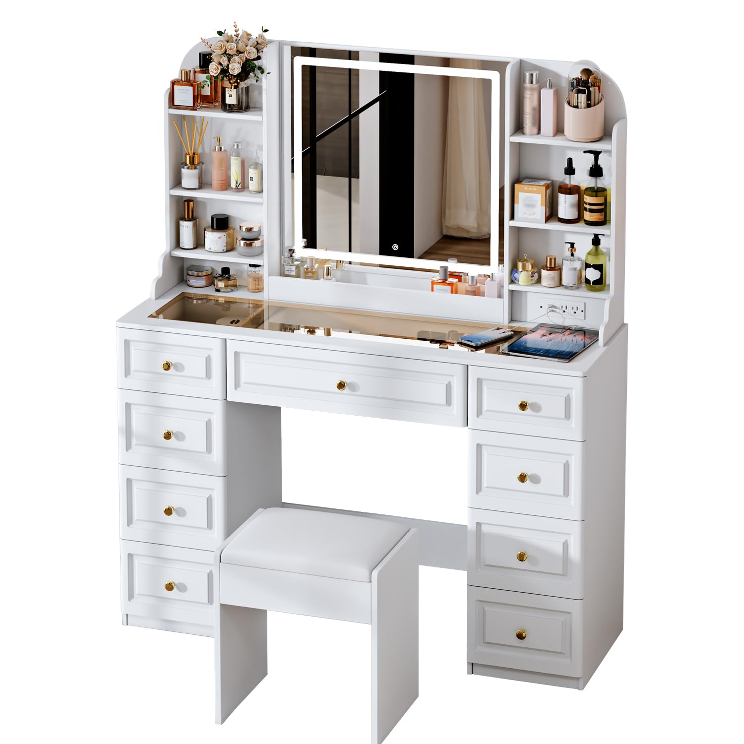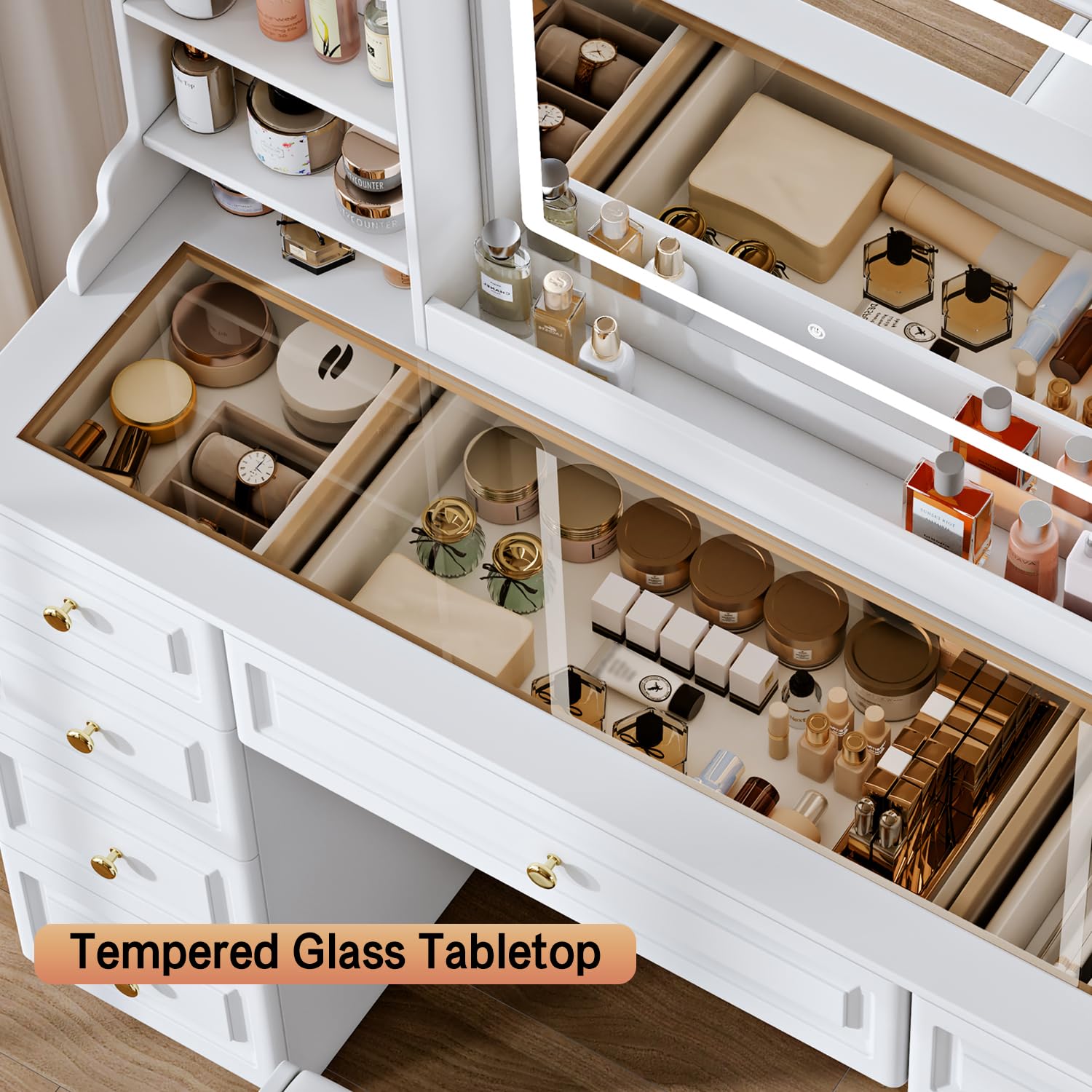 Arulvmrn 42" Makeup Vanity Desk with Mirror and Lights, & Power Outl, Glass Top Big Vanity Table with 9 Drawers& 8 Storage Shelves, Dressing Table Set with Chair for Bedroom, White