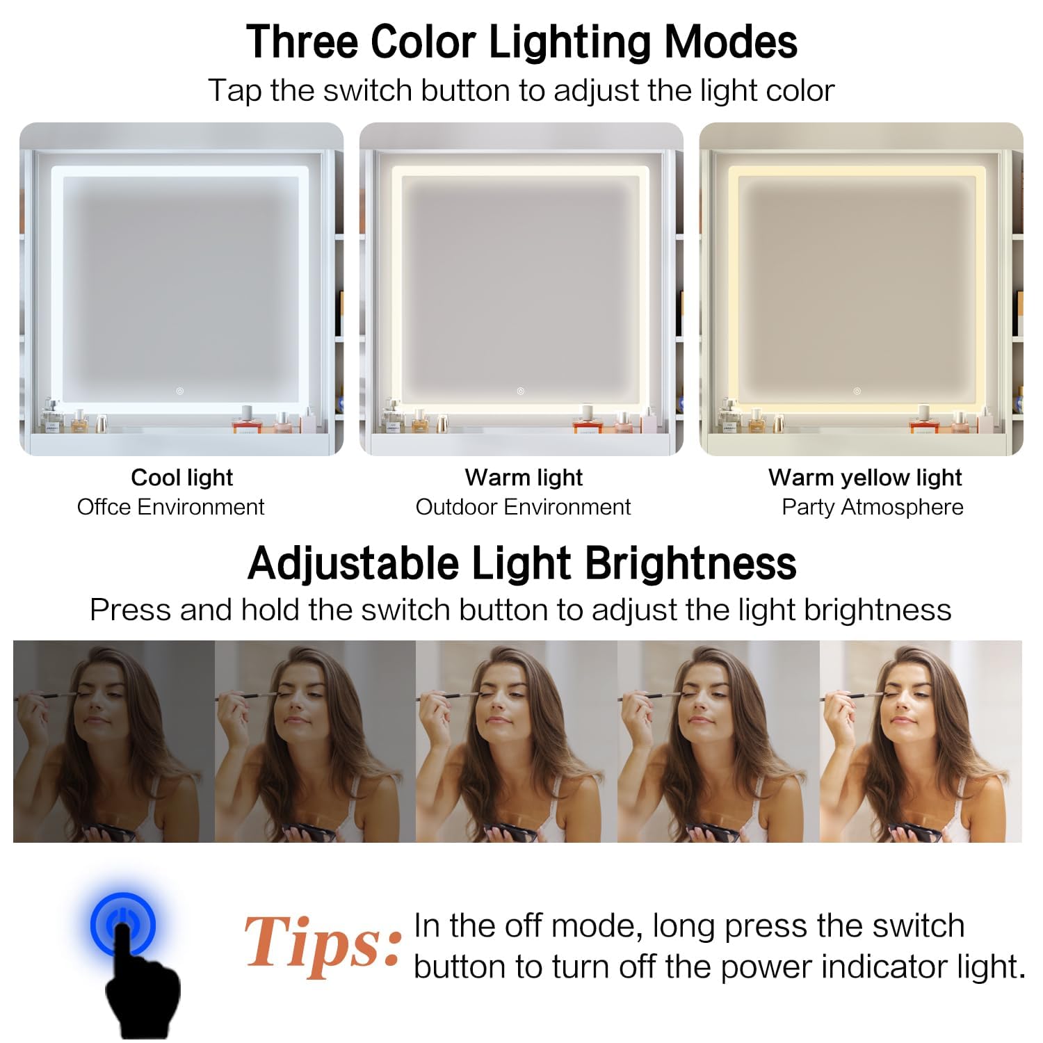 - Vanity with Lights: White makeup vanity features a high-definition makeup mirror with LED light. It has 3 different color modes (cool light, natural light, warm light) and the brightness of each light color. Makeup vanity freely meets your makeup needs for different occasions.