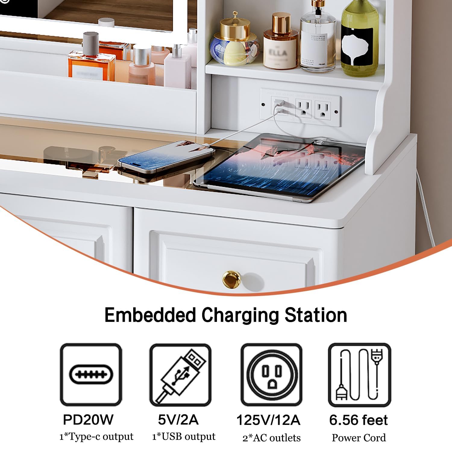 - 【Built-in Power Strip】Upgrade design!This makeup table equipped with a power strip that has 2 standard plug sockets ,1 USB ports and 1 T-C with a 4.9-foot power cord,convenient for the LED lights,hairdryer, curling iron, and charge your phone, tablet, or other electronics.