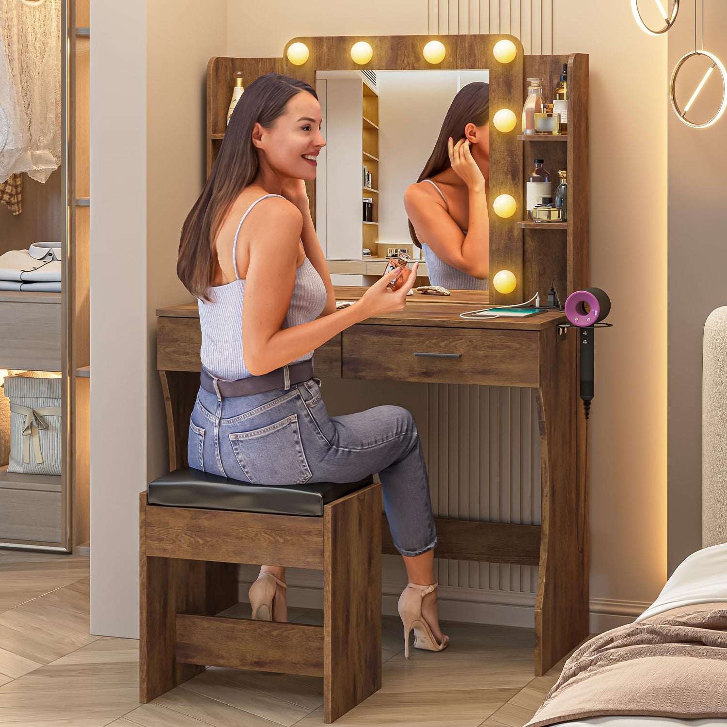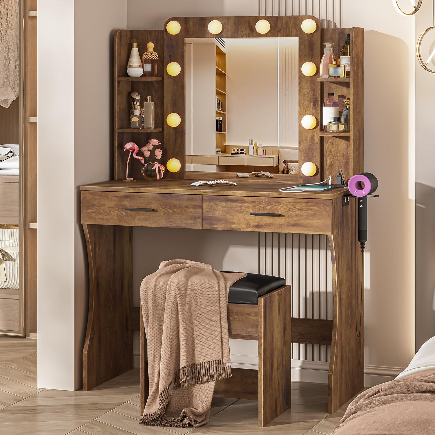 Befrases Vanity Desk with Mirror, LED Lights and Power Outlet, Makeup Vanity with 2 Large Drawers,3 Lighting Modes & Adjustable Brightness, Dressing Desk with Cushioned Stool, Rustic Brown.