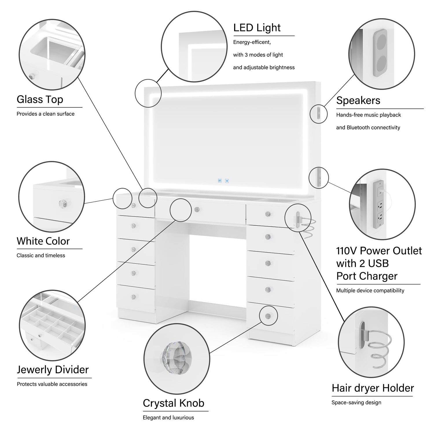 Boahaus Amelia Large Makeup Vanity Desk with Dimmable LED, 2 Bluetooth Speakers, USB Type C & Type A, 110 V Power Outlet, 11 Drawers, Crystal Knobs, Hair Dryer Holder - Premium White