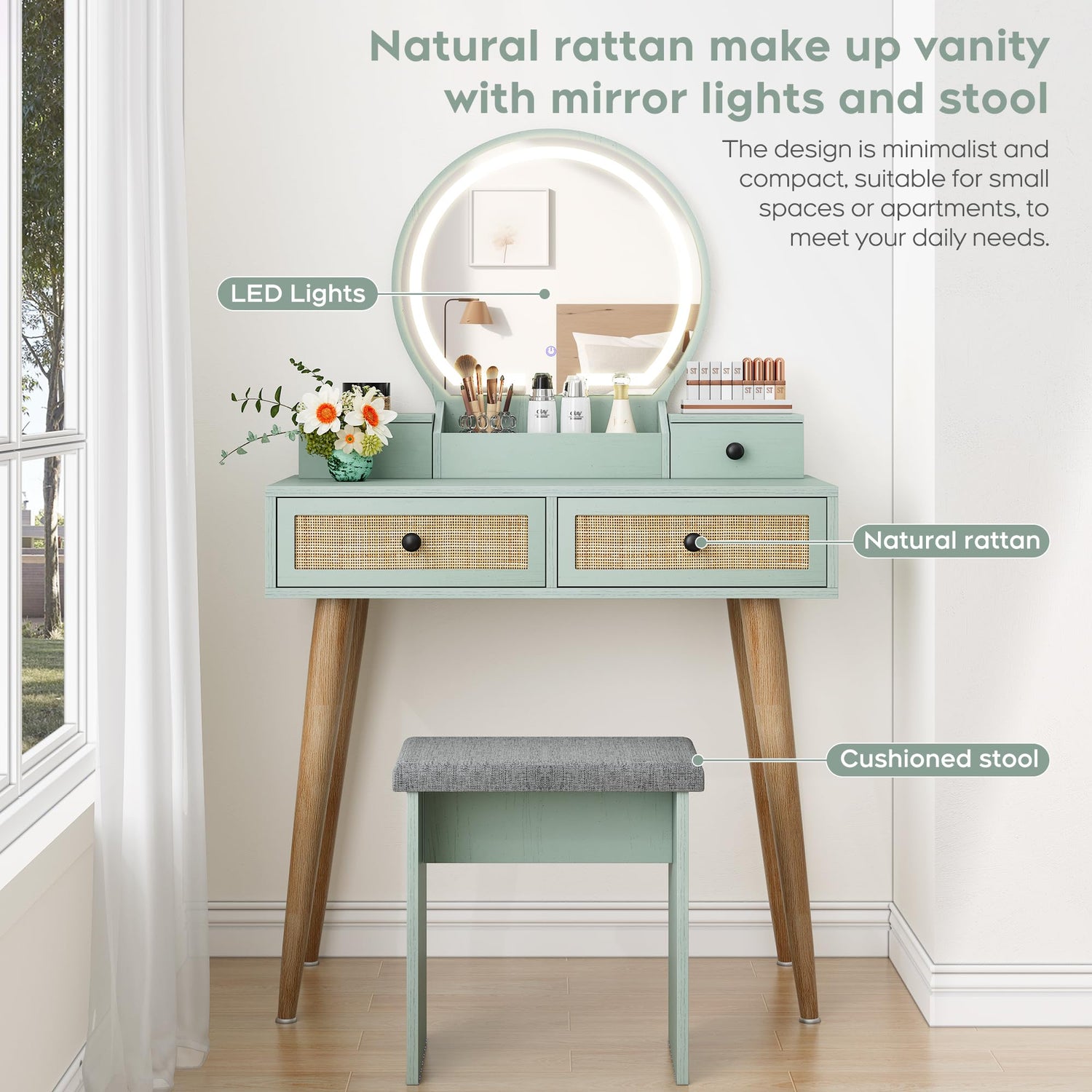 Brafab 31" Boho Natural Rattan Vanity Desk Set with 3 Modes Adjustable Lighted Mirror and Cushioned Stool, Modern Compact Design Makeup Table for Bedroom, Cute Dressing Table for Small Space, Mint