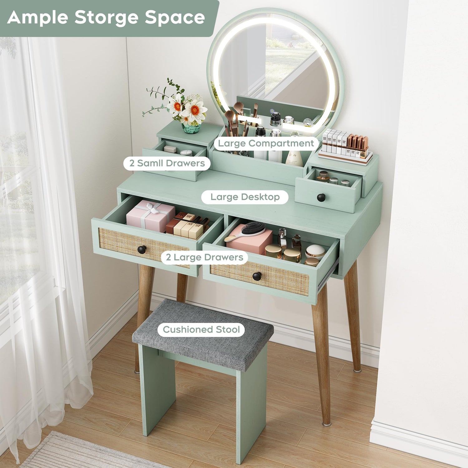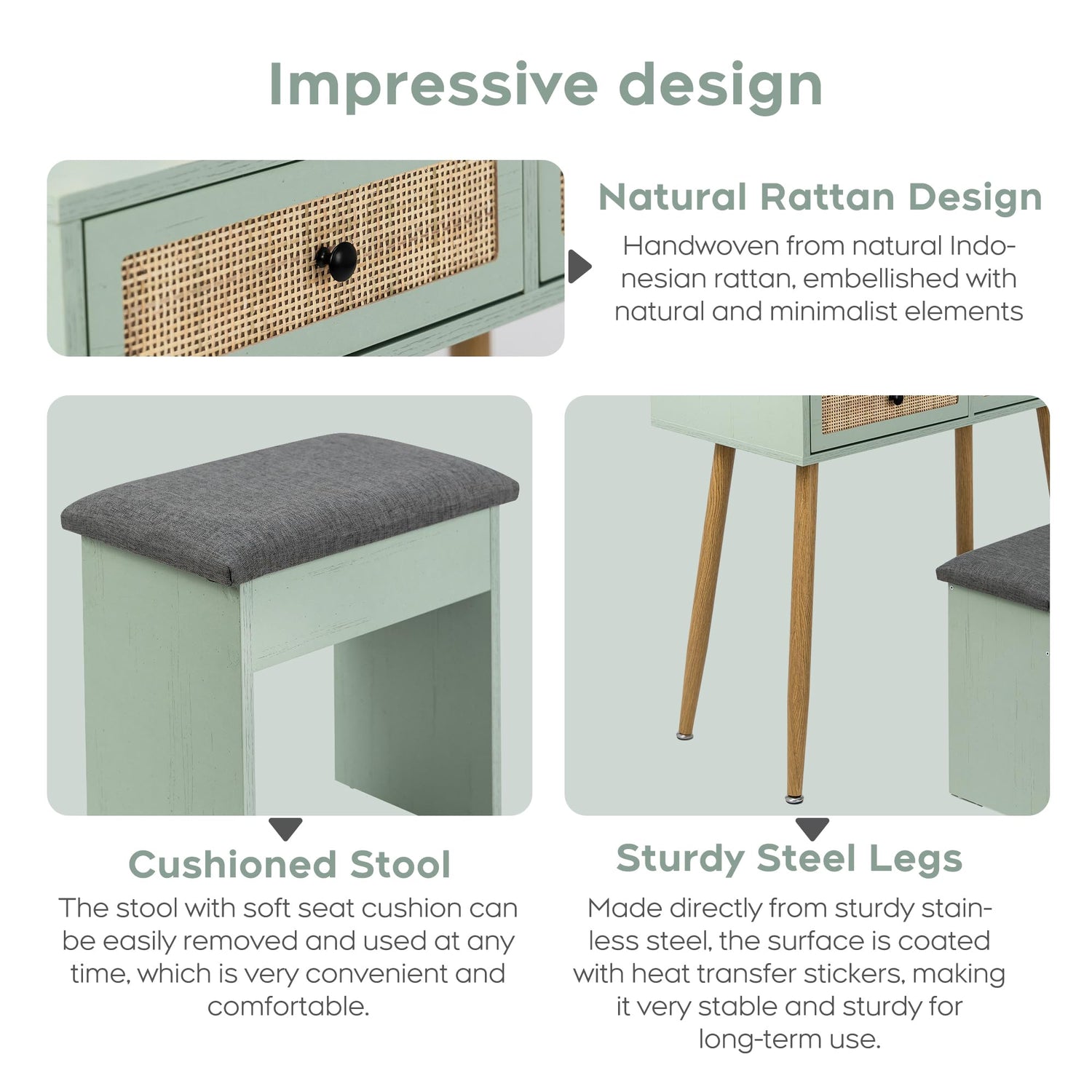 - This vintage rattan vanity desk features a retro exterior design, paired with environmentally friendly MDF wooden boards and sturdy steel legs, also with a cushioned stool making it suitable for long-term use. The mint green retro texture finish on the surface makes the overall makeup table eye-catching and stylish.