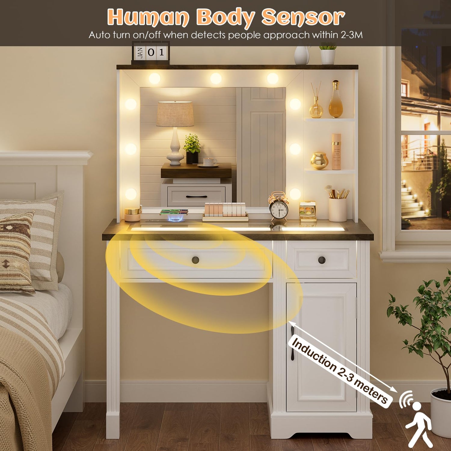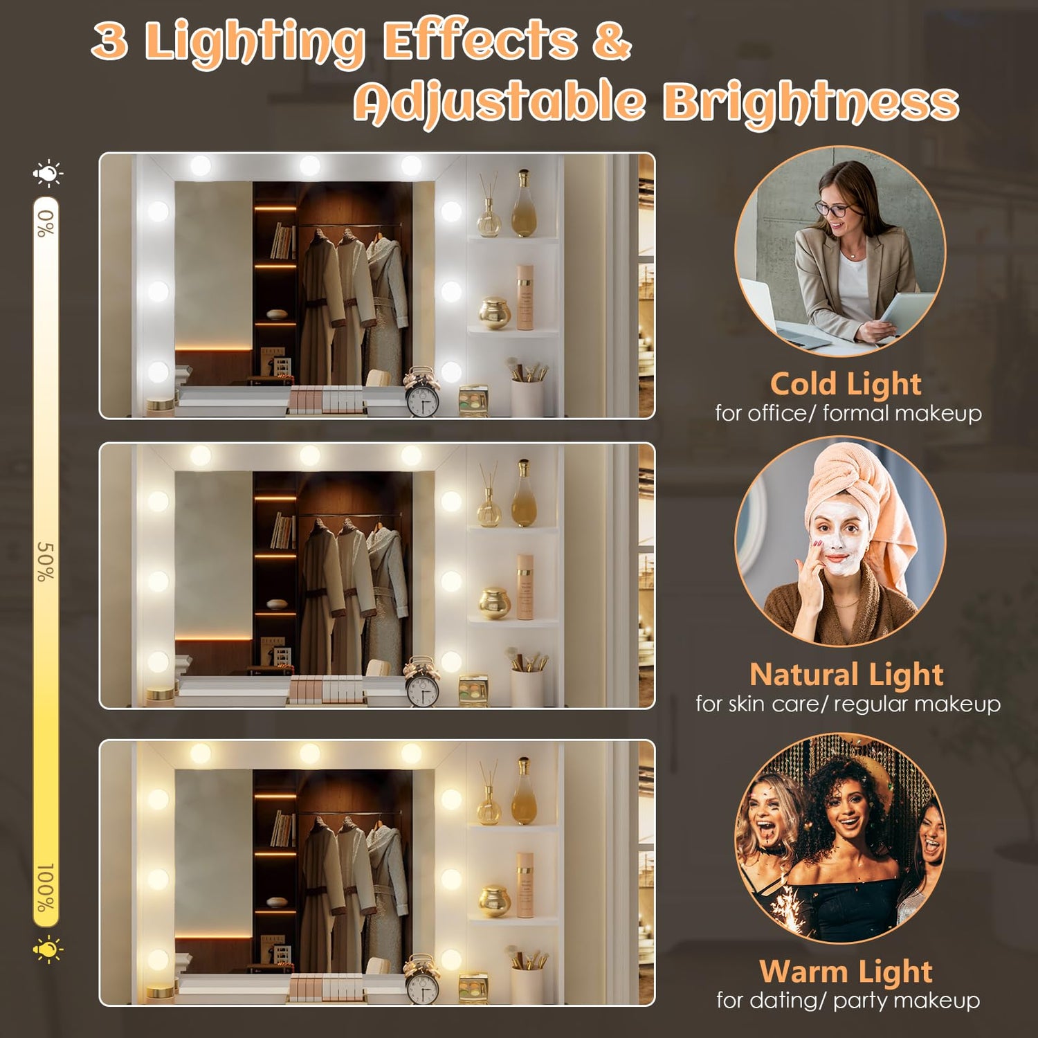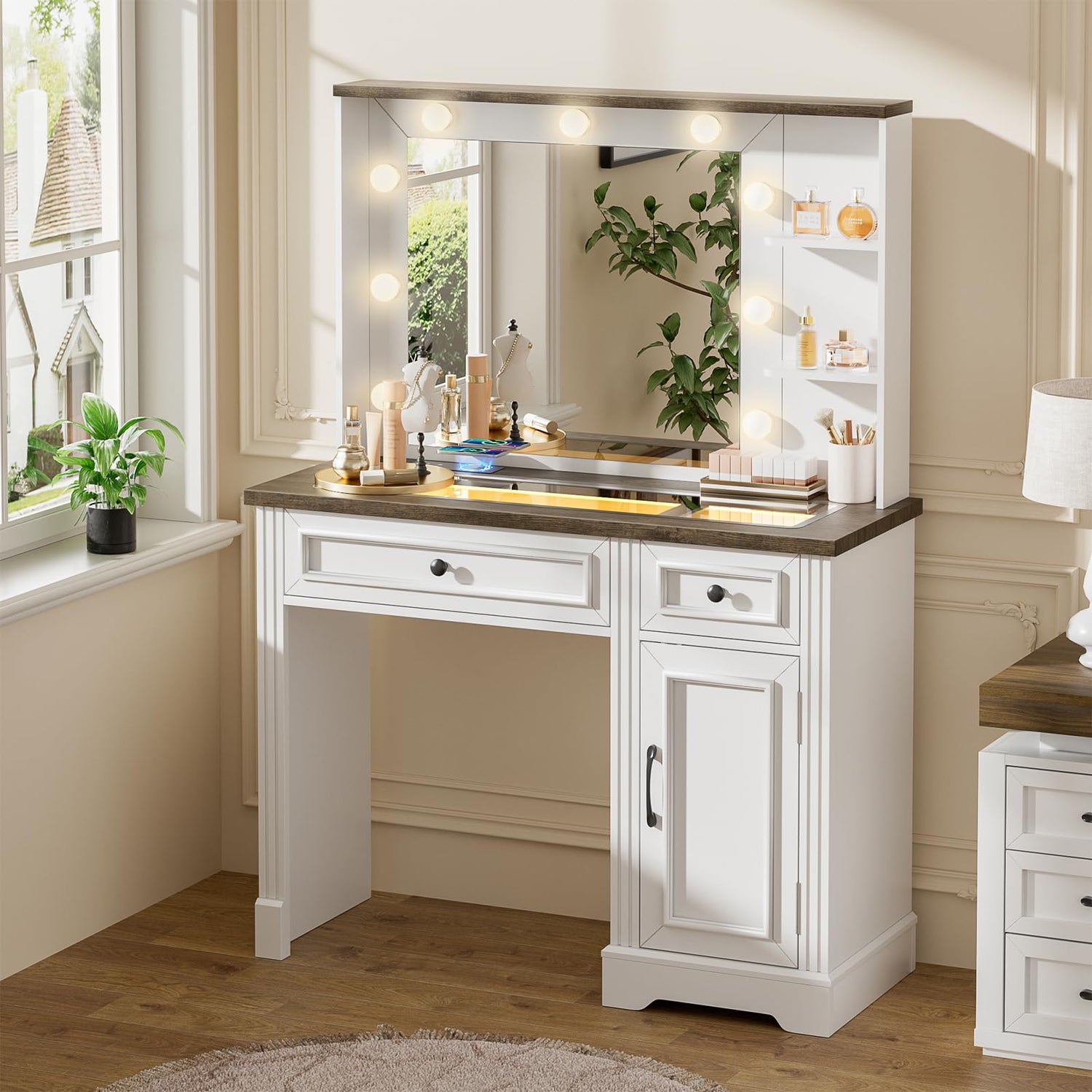 • 【Vanity with LED Mirror and Lights】Our makeup vanity features 3 color modes (warm, natural, and cold), brightness adjustable. Simply touch the switch for applying makeup, hairstyle or taking photos on this hollywood mirror, ideal addtion to your bedroom.
