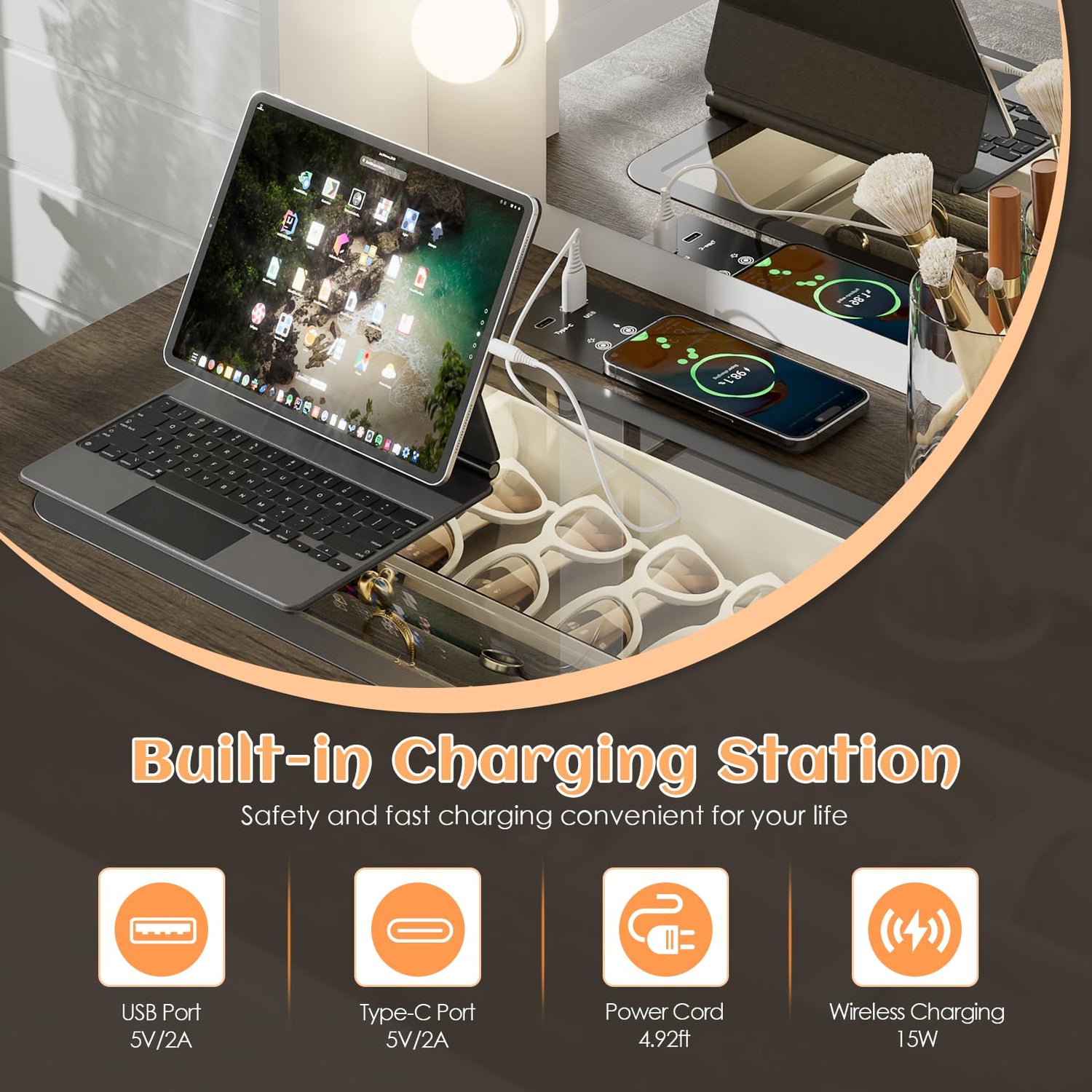 • 【Wirless Charging Station】This farmhouse vanity table offers wireless charging, USB and Type-C ports to allow you charge your phone, tablet, or other electronics. Without moving your position, you coud finish your exquisite makeup in this vanity desk.