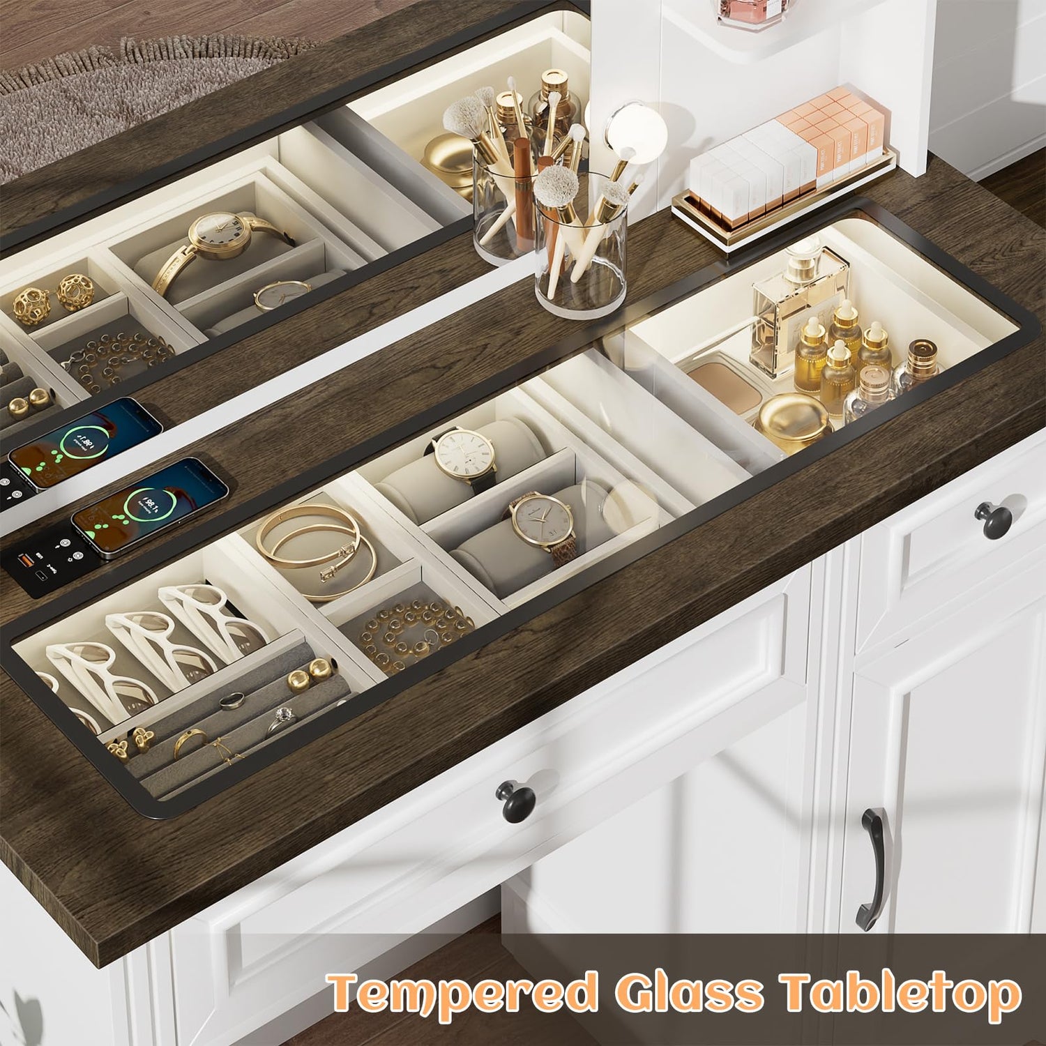 • 【Visible Glass Tabletop】 This vanity desk blend classic farmhouse style with modern elegance. The tempered glass top for easy access to your makeup essentials.