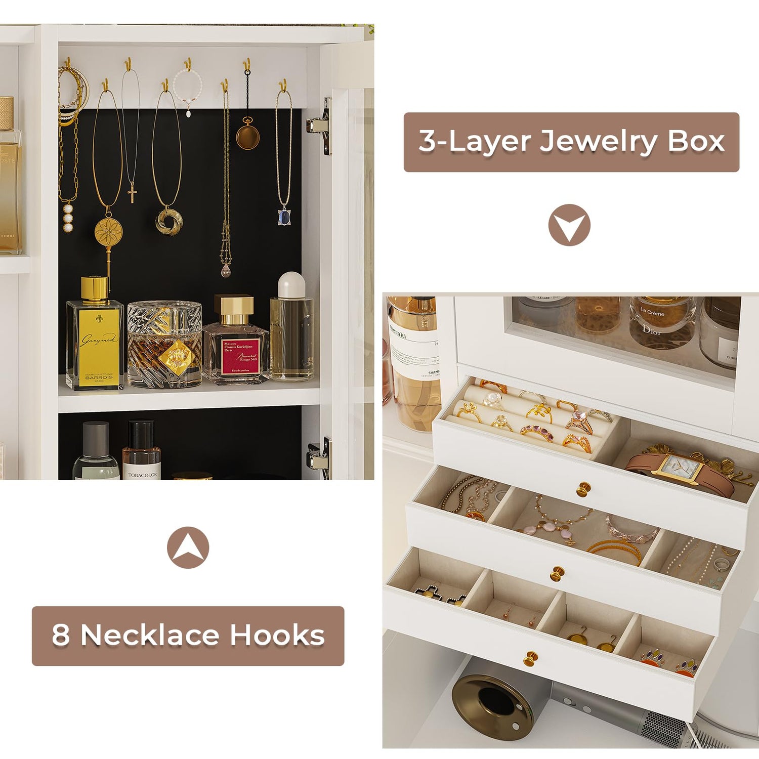 - 【Ample Storage Space】One shelf at the top, 9 shelves behind the mirror, a glass cabinet on the right side and 5 drawers can hold all your cosmetics, skincare products, beauty tools and more. In addition, 8 necklace hooks and a 3-tier jewelry box provide storage for your jewelry.