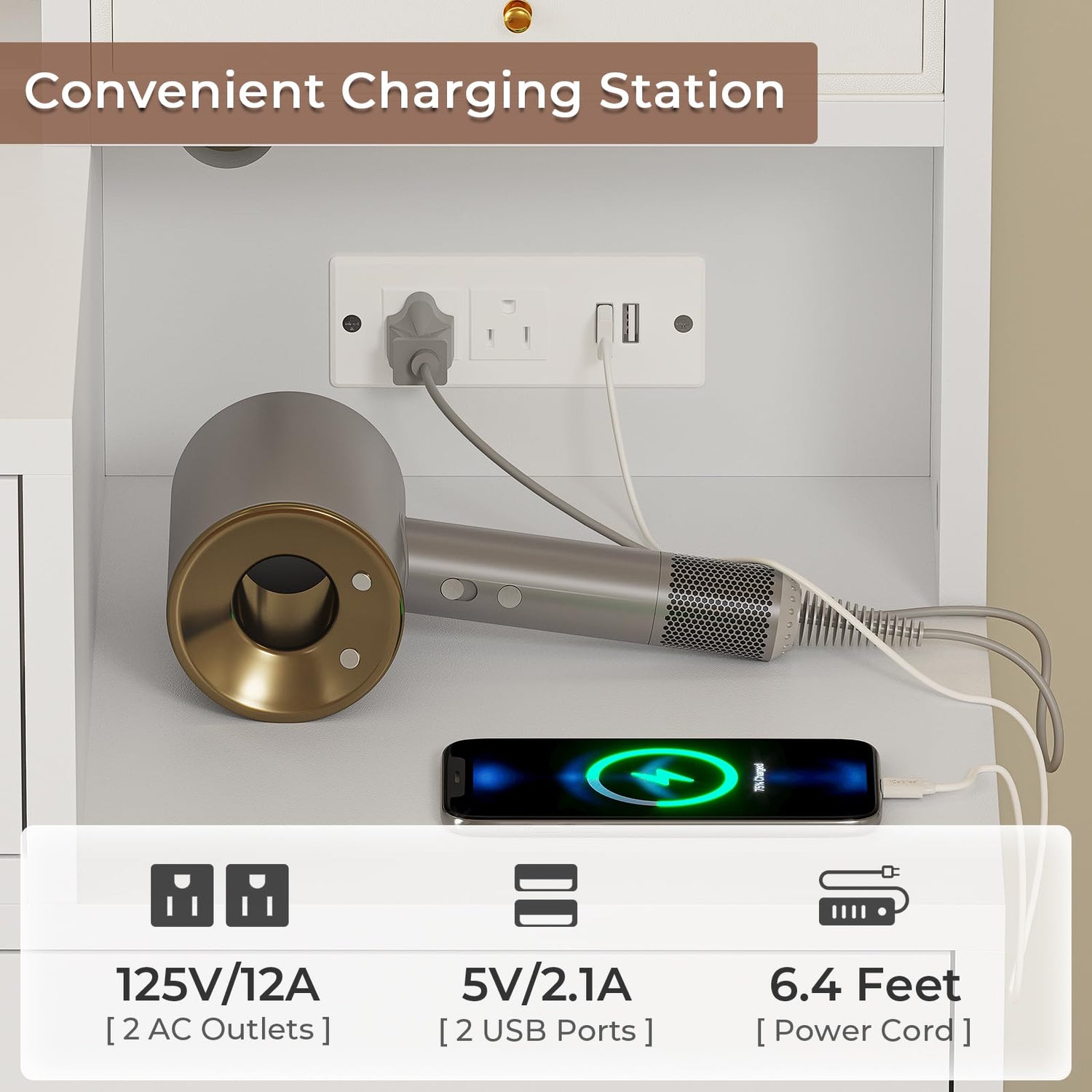 - 【Convenient Charging Station】No more anxiety about charging! The built-in power strip of this makeup table includes 2 USB ports and 2 standard outlets, making it easier to connect a hair dryer, beauty instrument, and charge mobile phones, tablets, or other electronic devices at the same time. Bringing you more convenience.