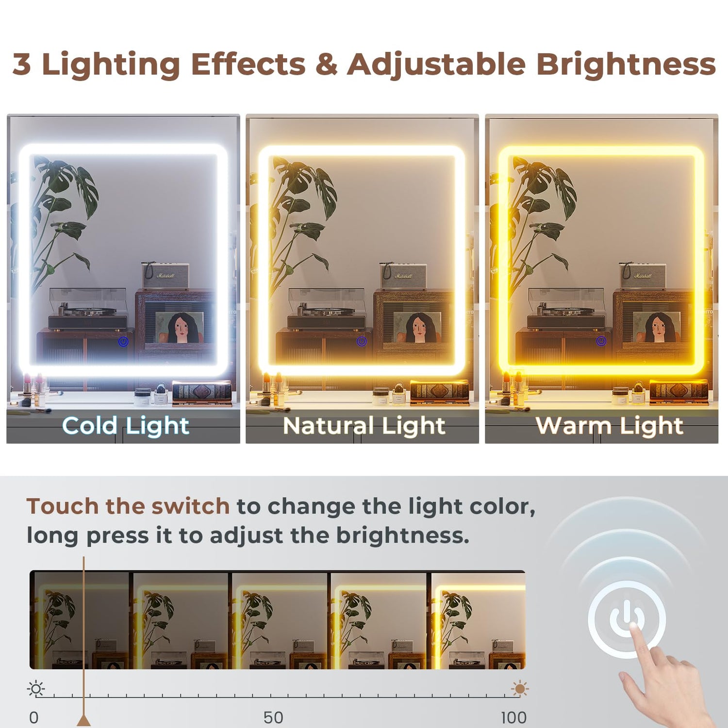 - 【3 Color Modes of Light】The vanity desk with mirror is equipped with LED lights to provide you with bright and soft light. There are 3 light colors for you to choose from: cool white (for official makeup), warm white (for skin care or daily makeup), warm yellow (for dinner or party makeup), and the light brightness can be adjusted for each color.