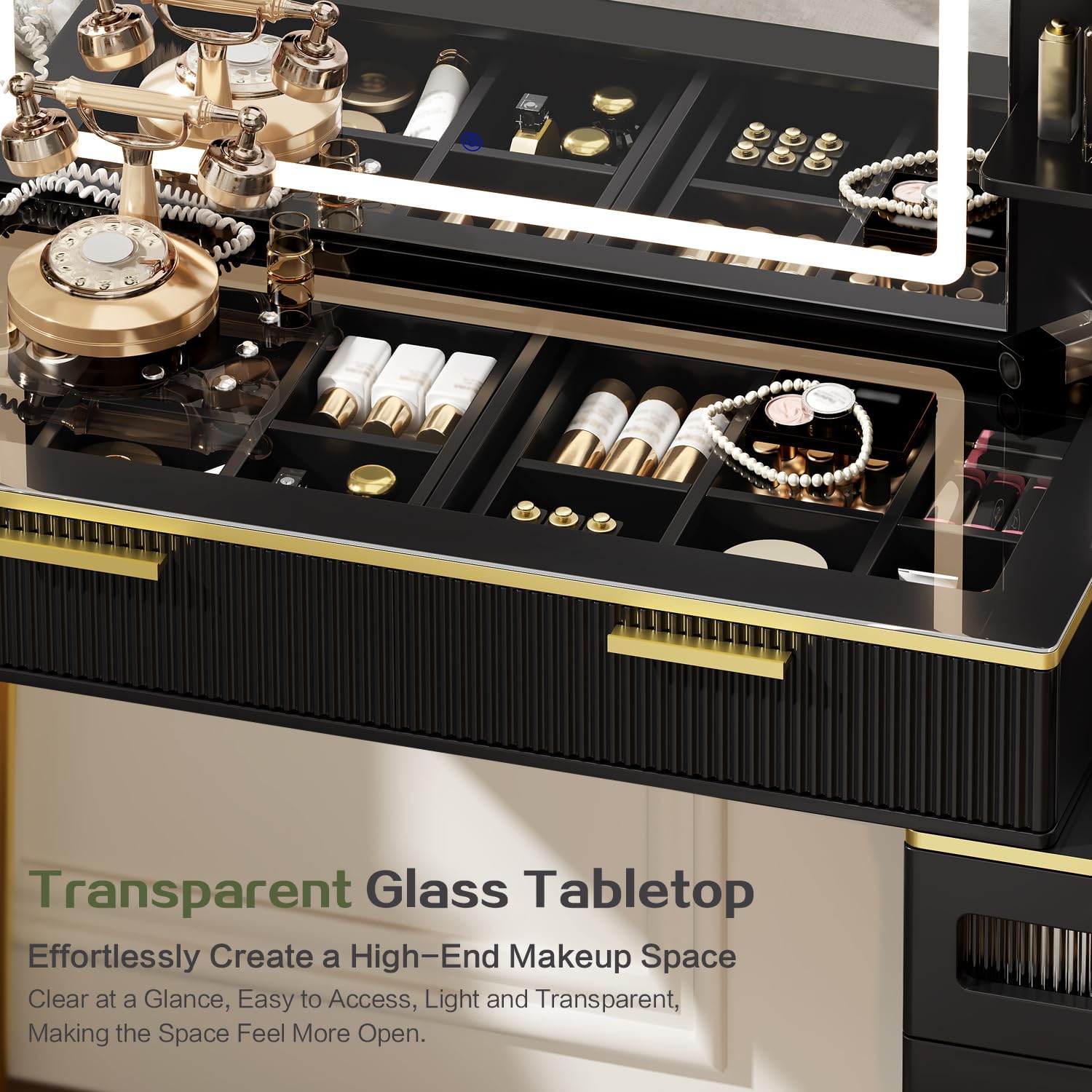 Chrangmay 47.24" Big Modern Vanity Desk with Mirror and Lights,Makeup Vanity Desk with 5 Drawers and Storage Shelves & Power Outlet,Dressing Table with Glass Top, Black