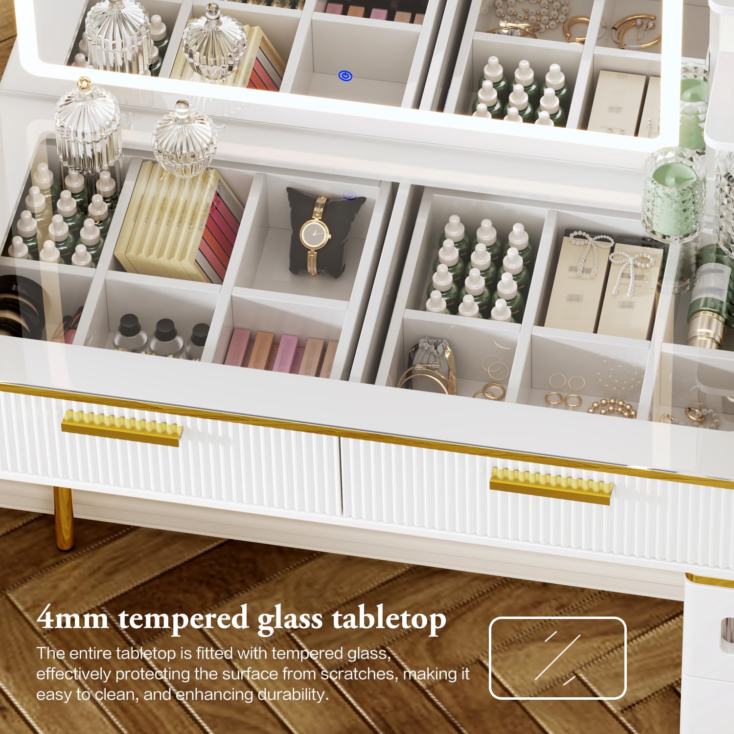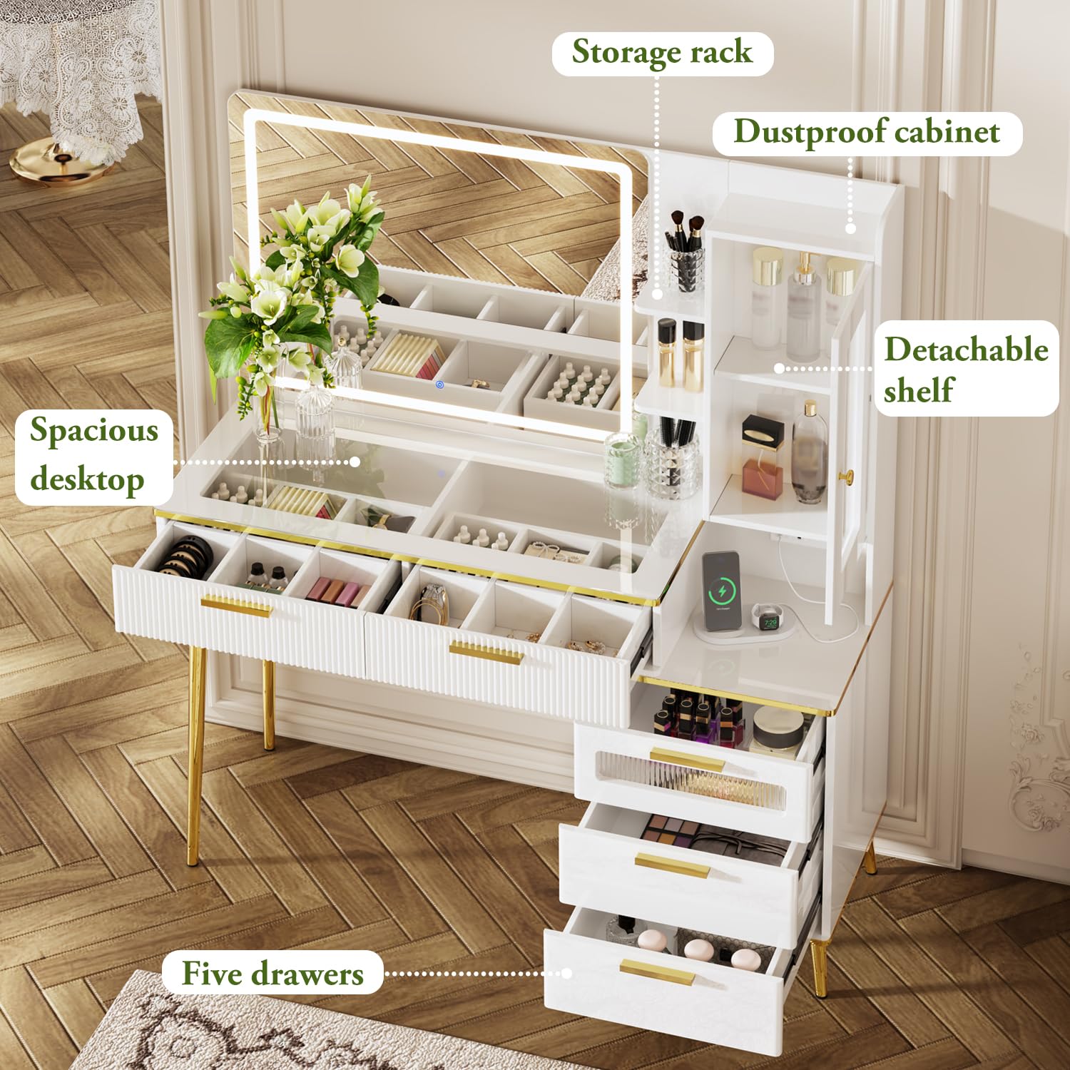 Chrangmay 47.24" Big Modern Vanity Desk with Mirror and Lights,Makeup Vanity Desk with 5 Drawers and Storage Shelves & Power Outlet,Dressing Table with Glass Top, White