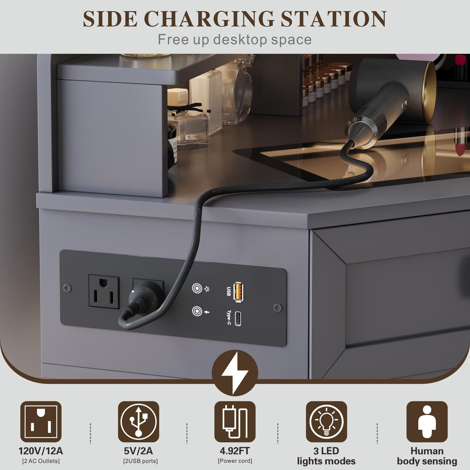 - Makeup Vanity with Power Outlet&Human Sensor: Modern Dressing table with 1x USB port, 1x Type-C,2 x Outlets Ports , easily charge your electronics without having to search for a separate power source,Vanity with human sensor lights, auto lights ON when detect human approach during 1-2M