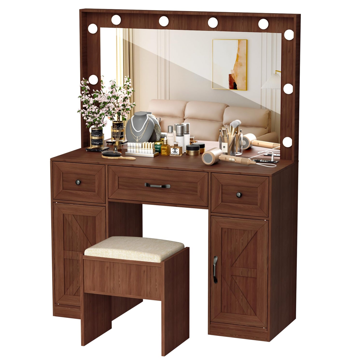 Crownland Vanity with Lighted Mirror, Makeup Vanity Table Set with Drawers and Charging Station, Vanity Desk with 3 Adjustable Lighting Modes and Stool Set(Brown)