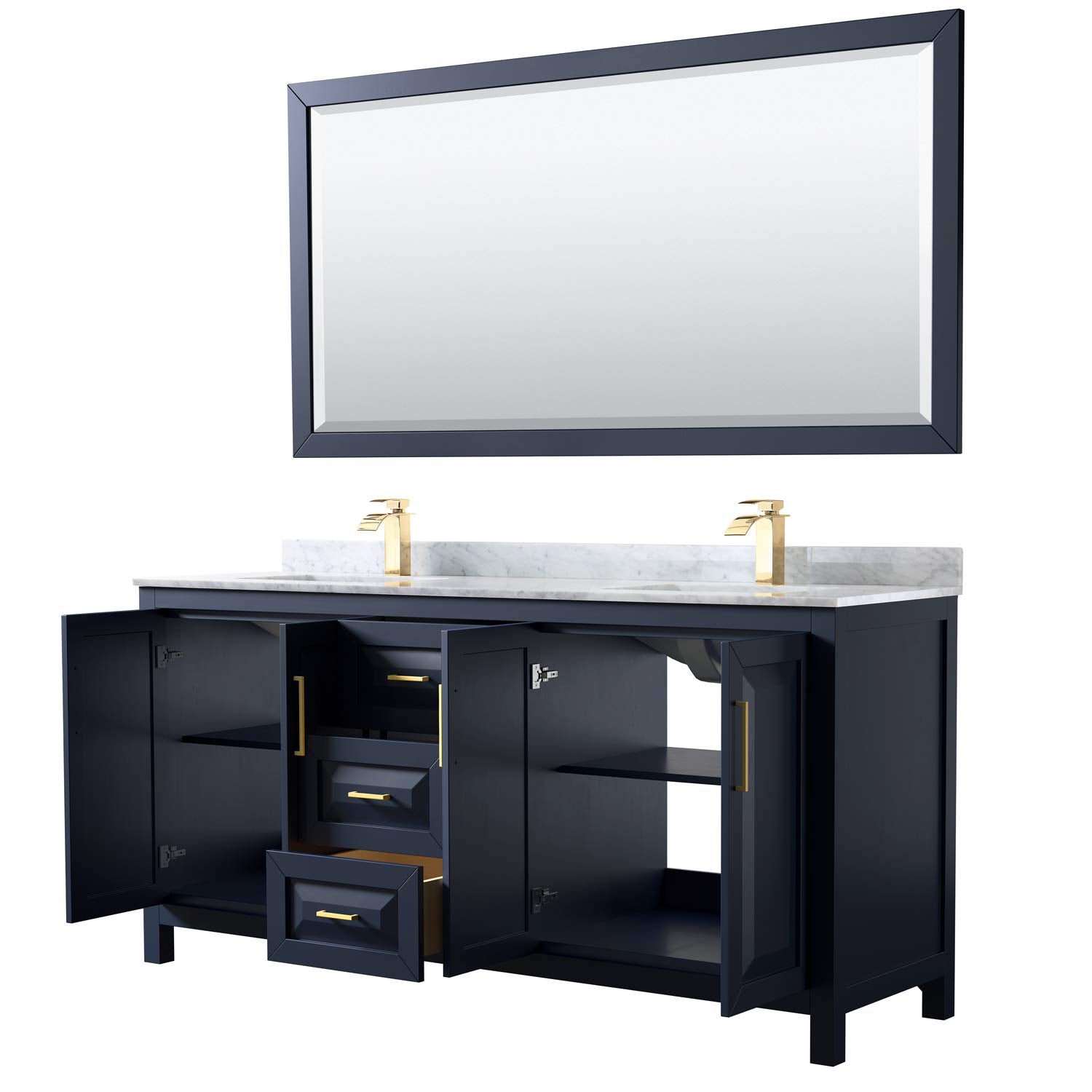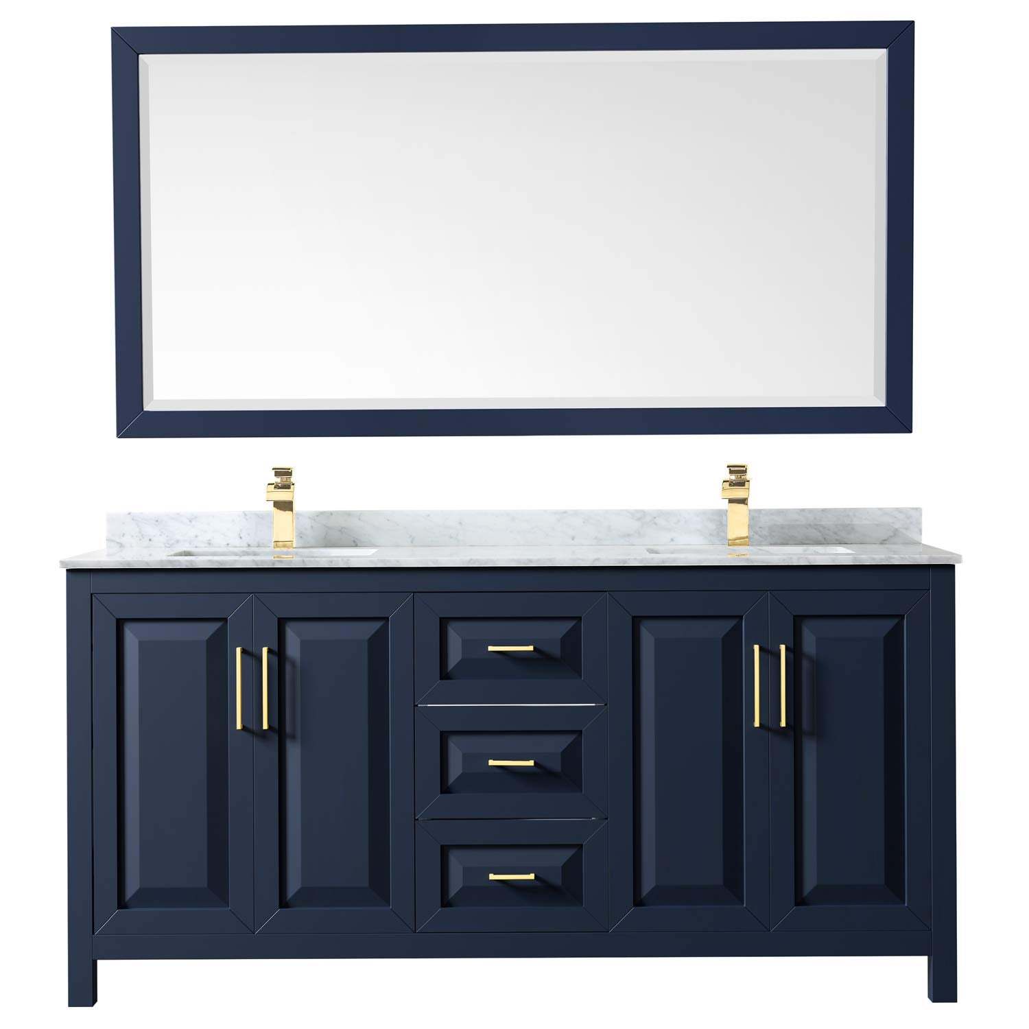 Daria 72 Inch Double Bathroom Vanity in Dark Blue, White Carrara Marble Countertop, Undermount Square Sinks, 70 Inch Mirror