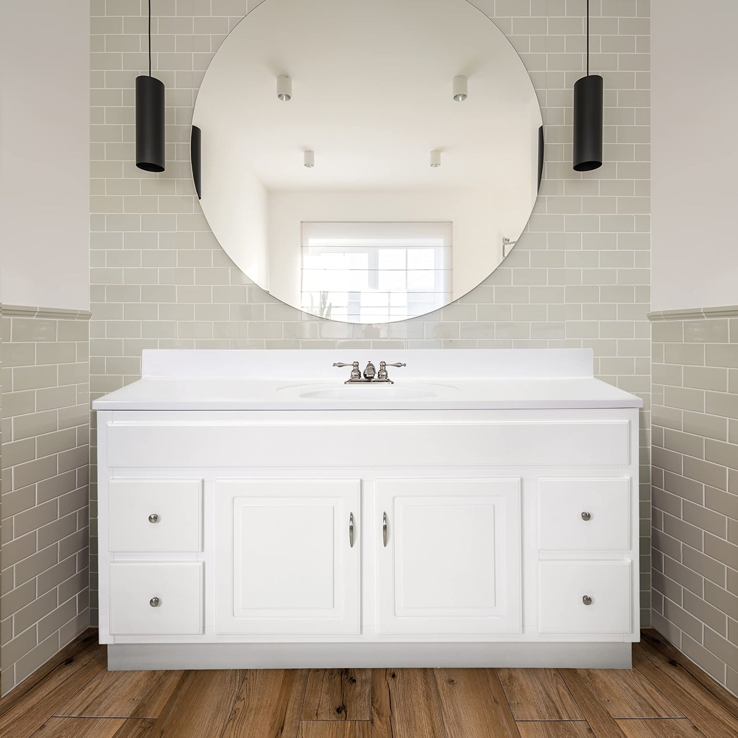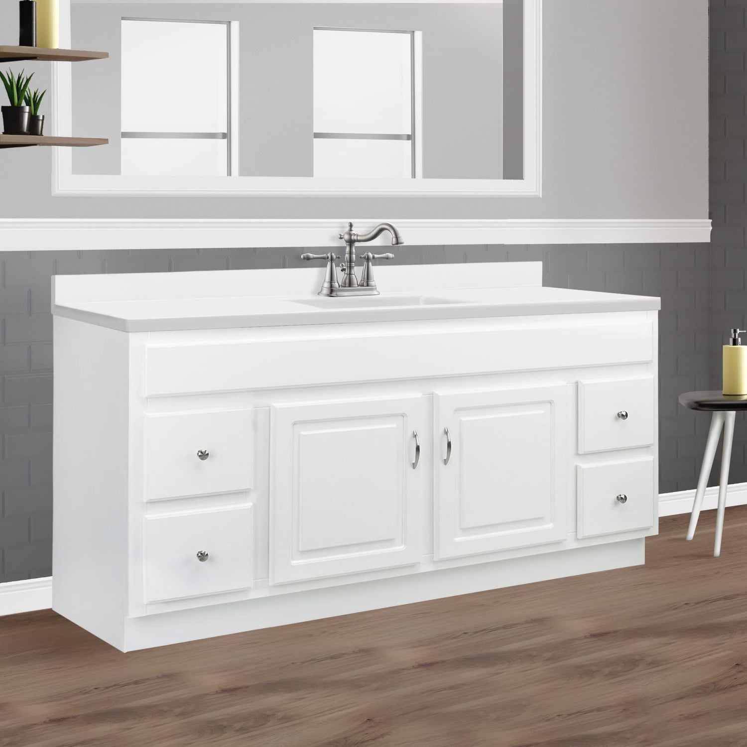 - Classic Design: Raised paneling on door and drawer fronts with satin nickel cabinet knobs blend seamlessly with a variety of decor styles; vanity top not included so you have the freedom to choose a vanity top that suits your style