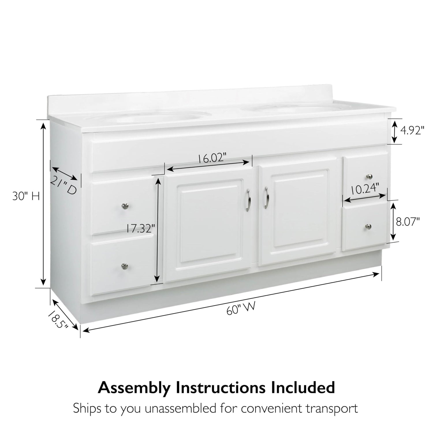 Details: Give your bathroom a boost of elegance with the Design House 60inch Concord Vanity Cabinet. Modern design meets traditional charm; this piece offers clean lines and a durable white finish. Features include (4) fully functional drawers with easy glide drawer hardware and (2) doors that conceal generous interior space, perfect for storing toiletries, cleaning supplies, and more. The vanity base measures 60inch by 21inch and comes unassembled with satin nickel hardware included.