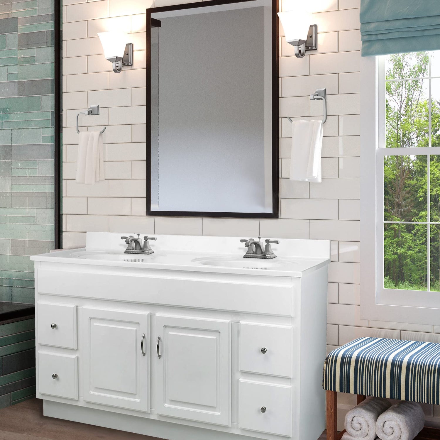 - Solid Wood Bathroom Vanity Base: This white finish wood base measures 60-inch W x 21-inch D accommodating a 61-inch W x 22-inch D vanity top in standard countertop materials including quartz, granite, and marble