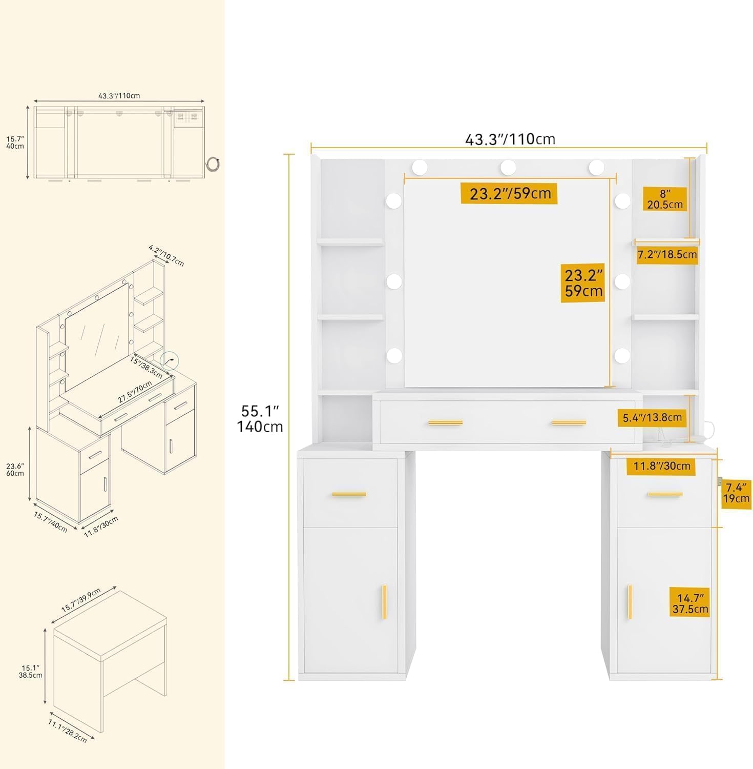 DWVO Vanity Desk with Large Mirror and LED Lights, Makeup Vanity Table Set with Power Outlets, Comfy Stool & Storage Drawers, Shelves and Cabinets, 3 Lighting Modes Makeup Table, Dressing Room, White