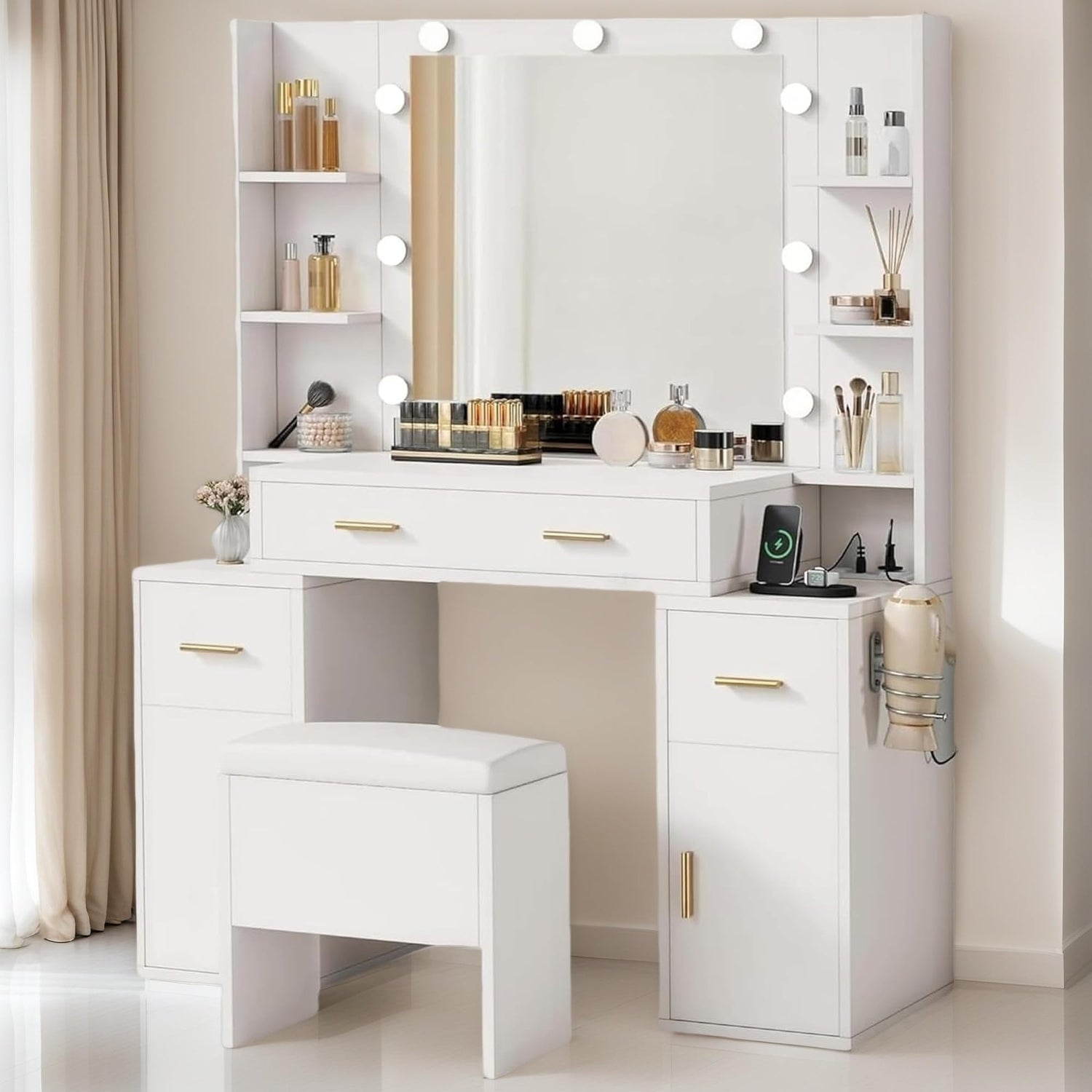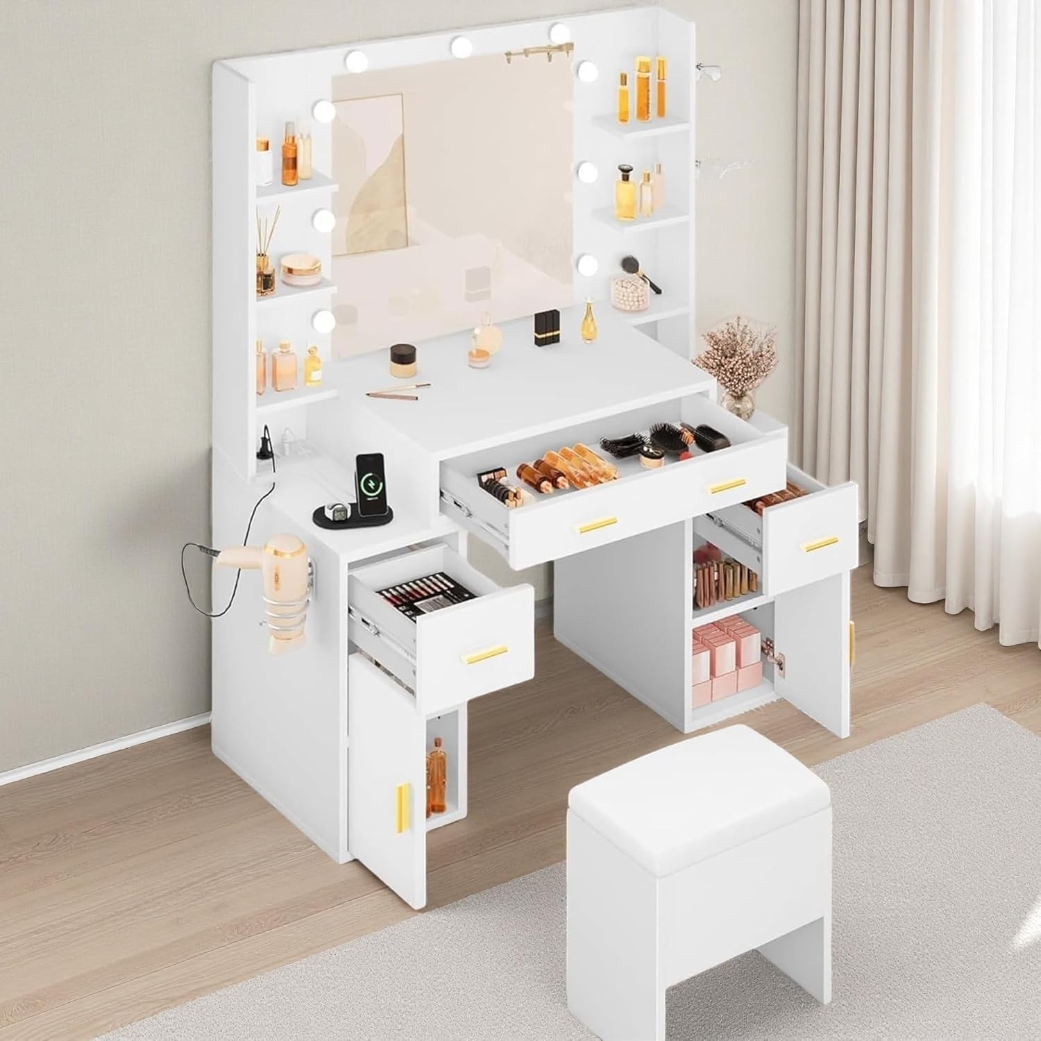 - Everything in Its Place: Your beauty collection deserves more than a drawer. With 6 open shelves, 2 drawers, and 2 cabinets, your makeup, skincare, and perfumes all have a home. Plus, the cushioned stool offers hidden storage for tools or secret snacks
