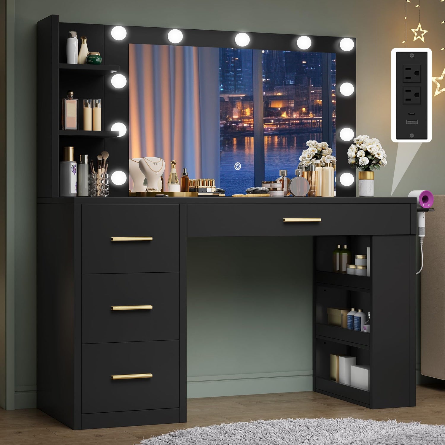 DWVO Vanity Desk with Mirror, Large Makeup Table with Power Outlets, 11 LED Bulbs, 3 Adjustable Light Modes, 4 Drawers and Built-in Shelves, Hollywood Dressing Vanity Desk Set for Bedroom, Black
