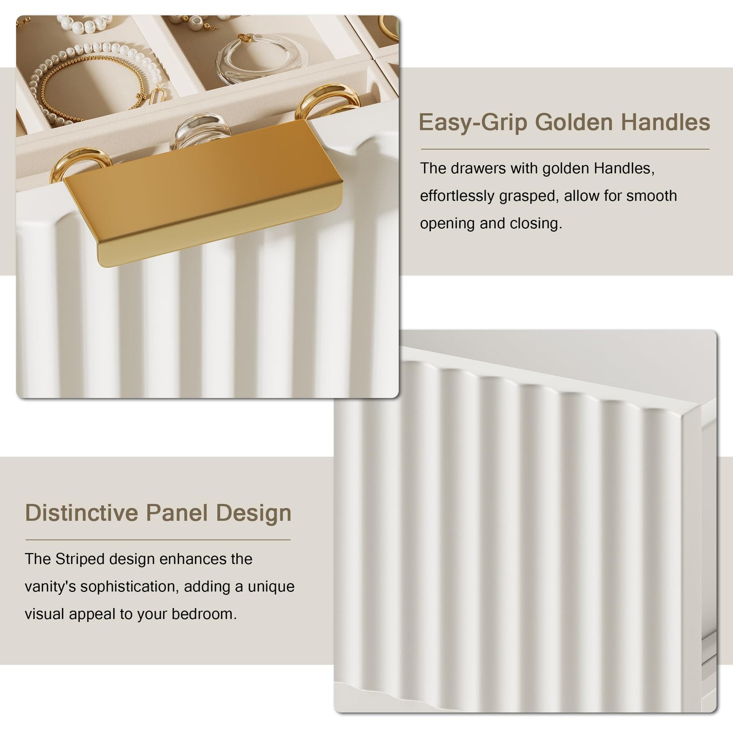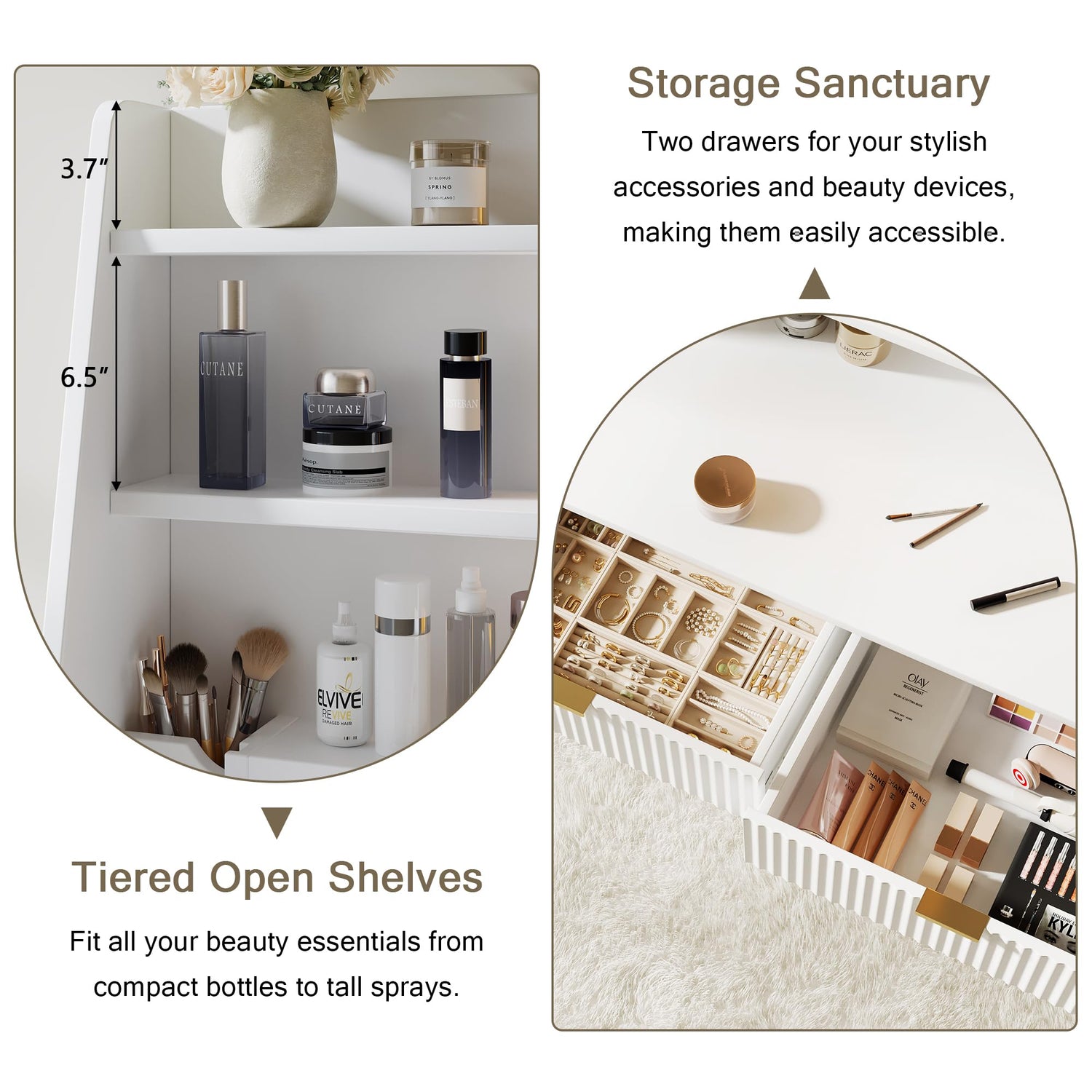• Generous Storage Areas: With open multi-tiered storage, keep all cosmetics within reach. Features incorporated storage areas for cosmetic tools, no additional brush organizer required. Dedicated storage for fashion accessories and beauty equipment with 2 spacious drawers, ensuring a clutter-free beauty zone