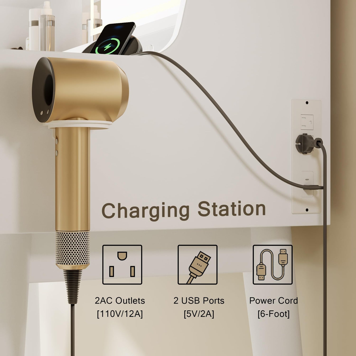 • Multifunctional & Practical: Built-in all-in-one charging station, charging equipment you need while applying makeup, without finding extra outlets. Equipped with an integrated blow dryer holder, offers a dedicated spot for the dryer, elevating beauty life with unparalleled practicality